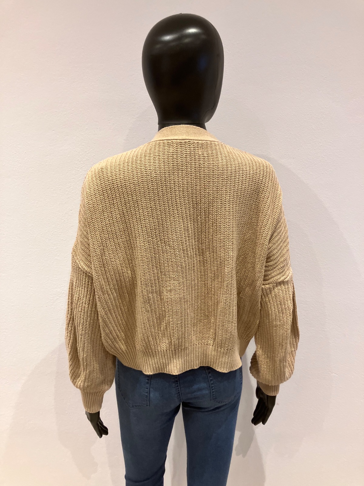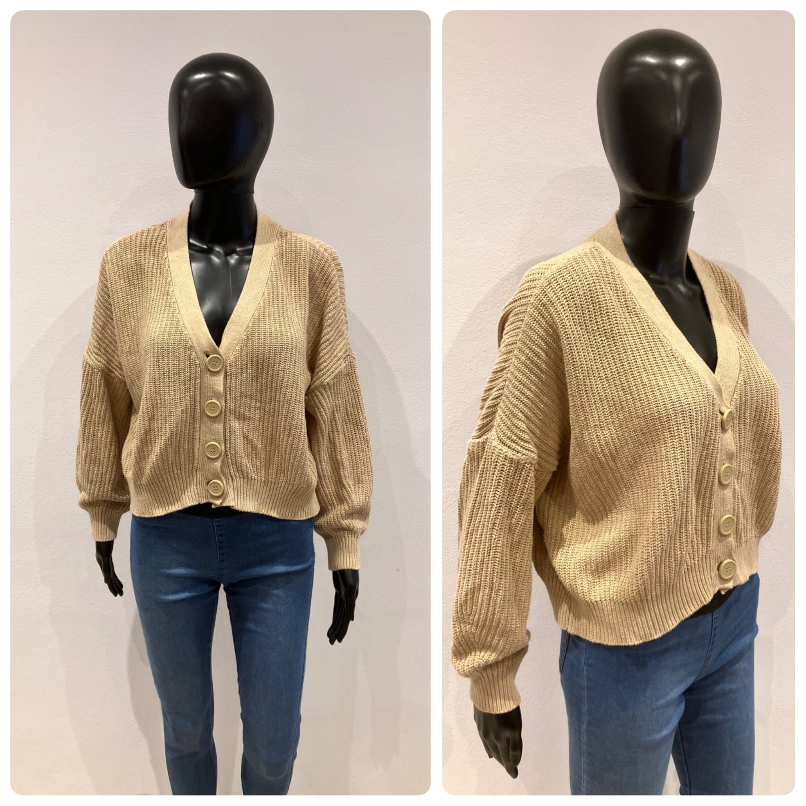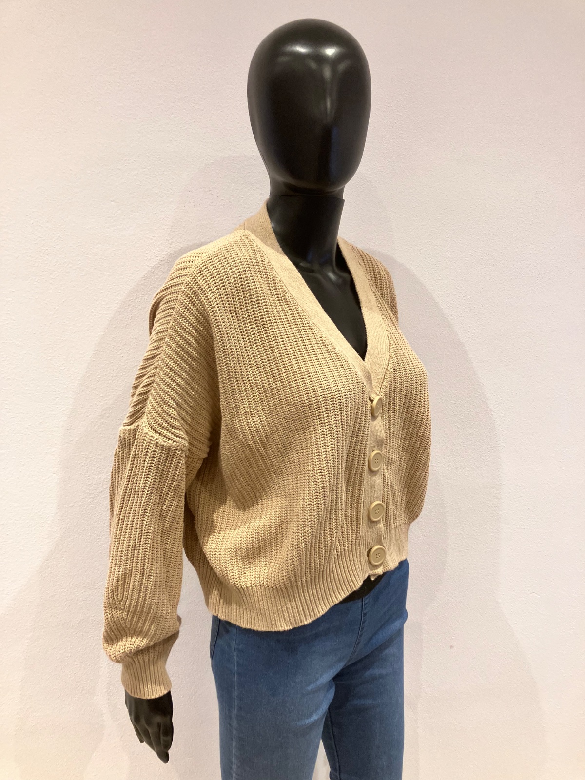 Dámsky ležérny sveter krátky, véčkový výstrih, zapínanie na gombíky, elastický, hrubší, materiál 100%bavlna.
