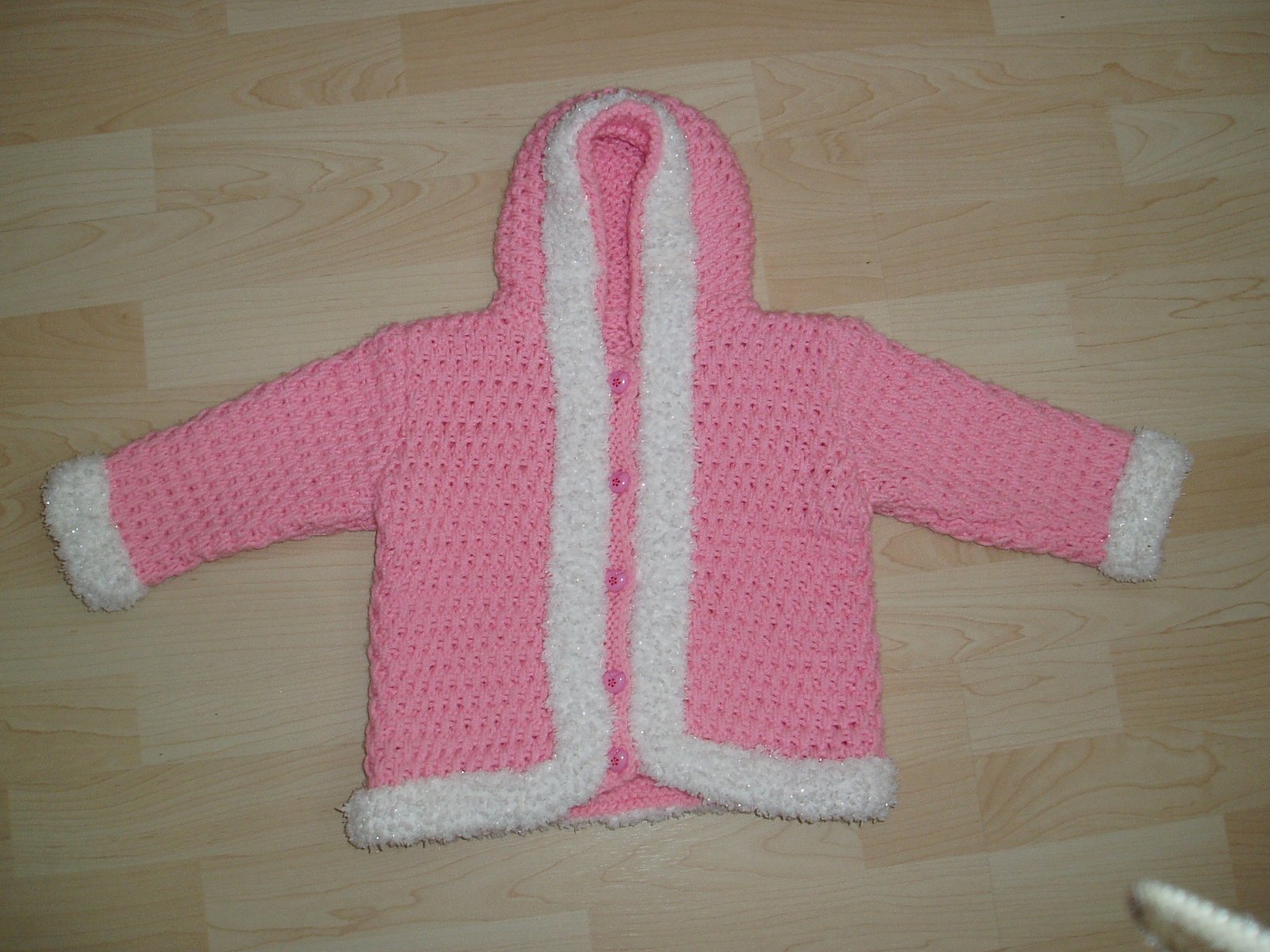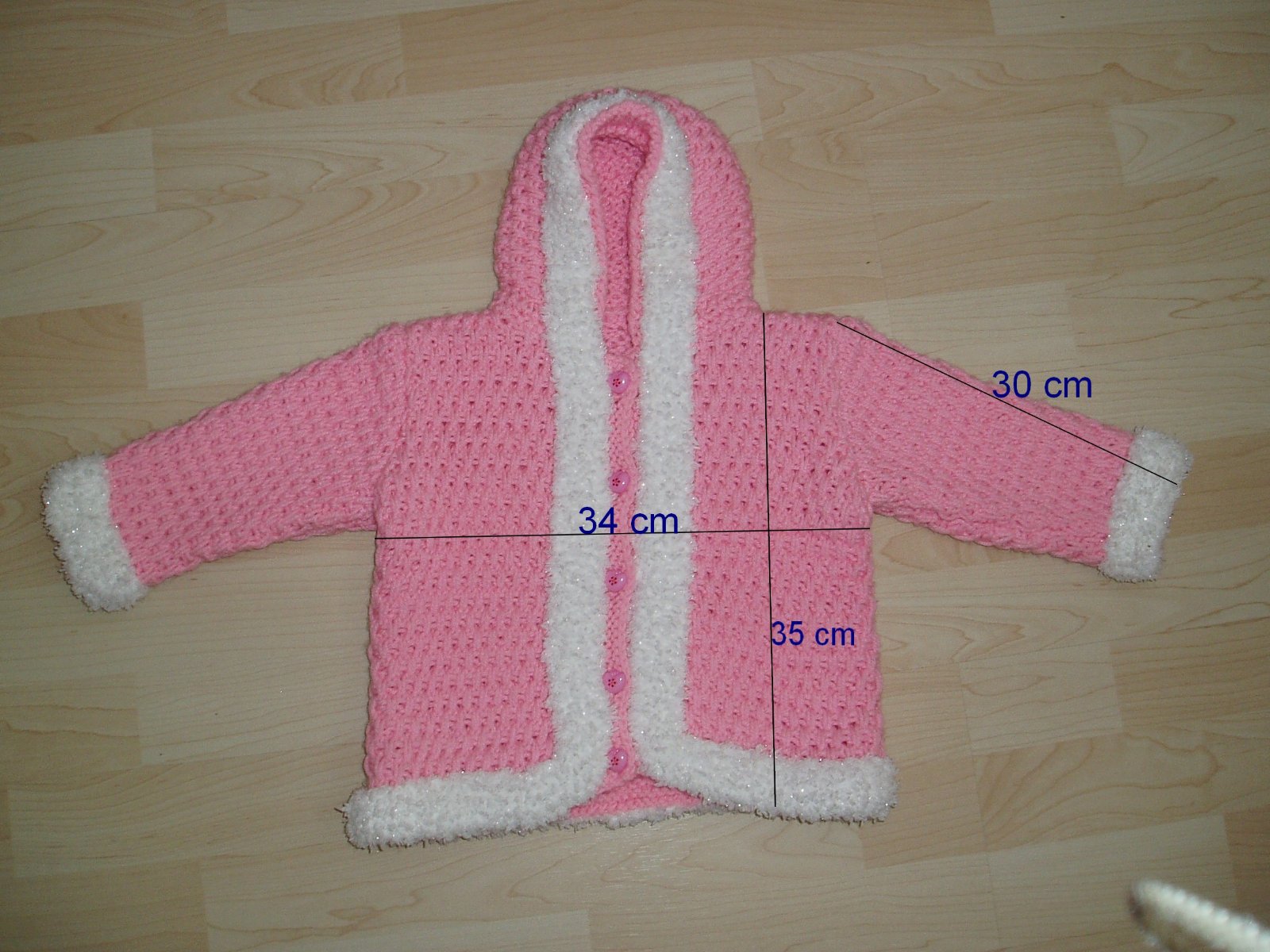 Ručne štrikovaný sveter s kapuckou, skôr hrubší a teplejší. Veľkosť odhadujem asi 92 cm. Krásny rúžový s bielym lemovany pre dievčatká, no keďže moja dcérka je ako chalan tak ho nechcela nosiť.