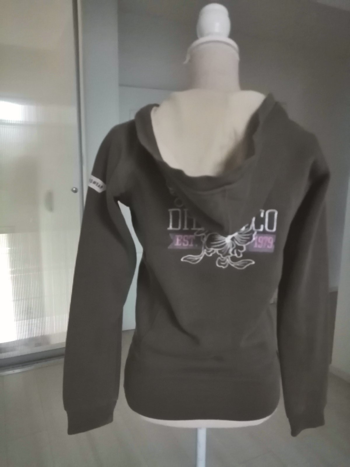 Mikina damska, je sice velkost XL ale zodpovwda M. Nakolko niekedy su mensie cisla znaciek, obvod hrudnika je 96 cm, rukavy 64 cm a dĺžka je 64 cm