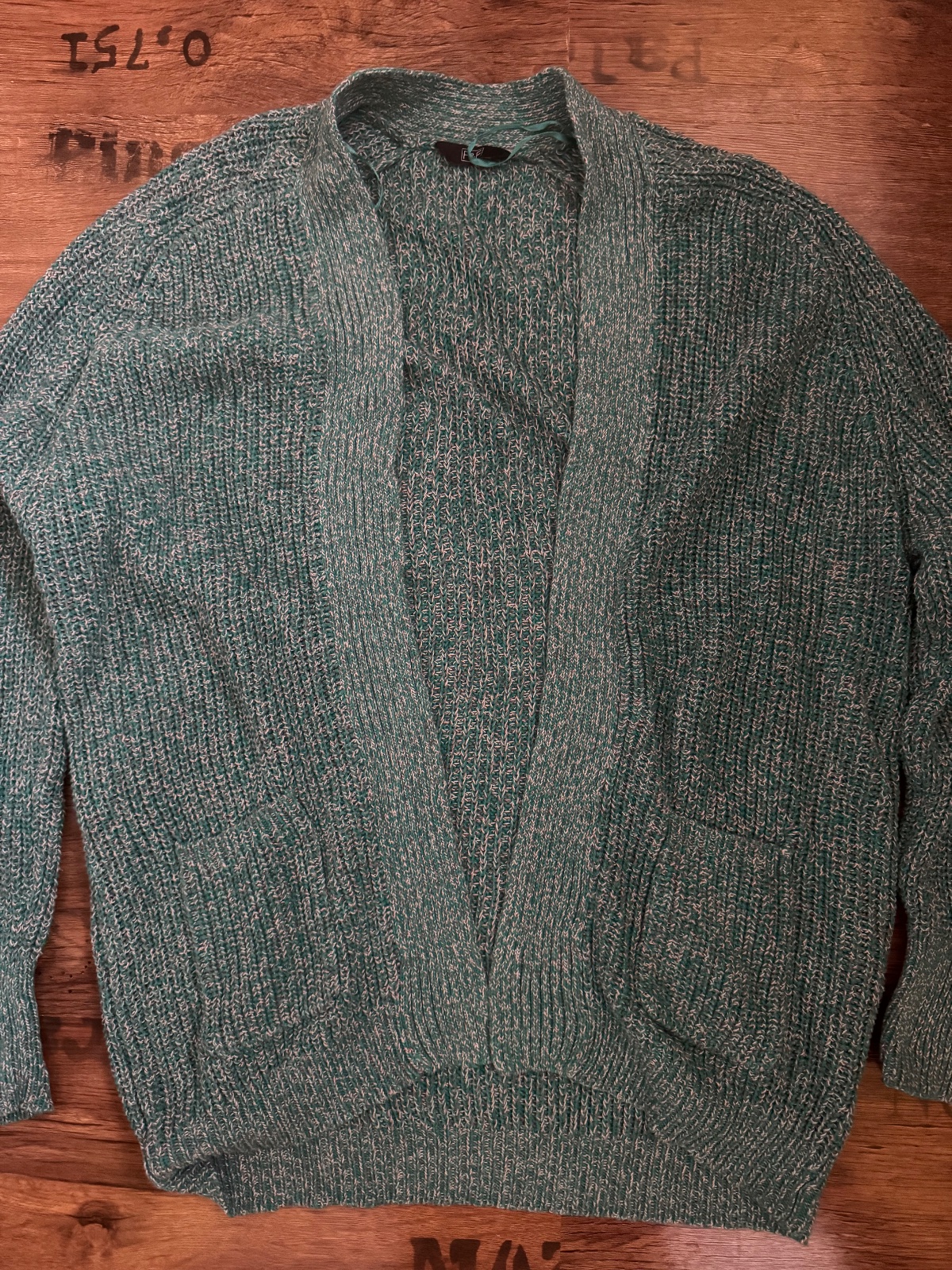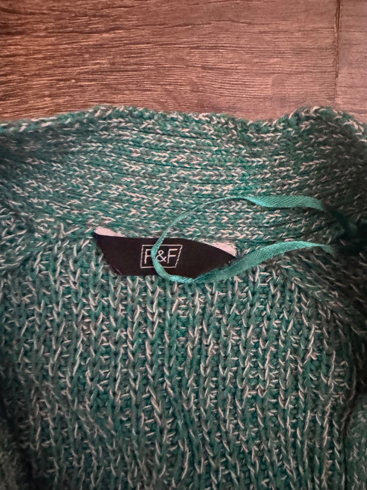 Ponúkam pekný svetrík / kardigán v melírovo zeleno-bielej kombinácii. Značka je F&F a veľkosť uvedená 44 ale kľudne sedí od S-XL, prispôsobí sa. Má vrecká. Bol málo nosený, vo vynikajúcom stave. Poštovné podľa taríf.