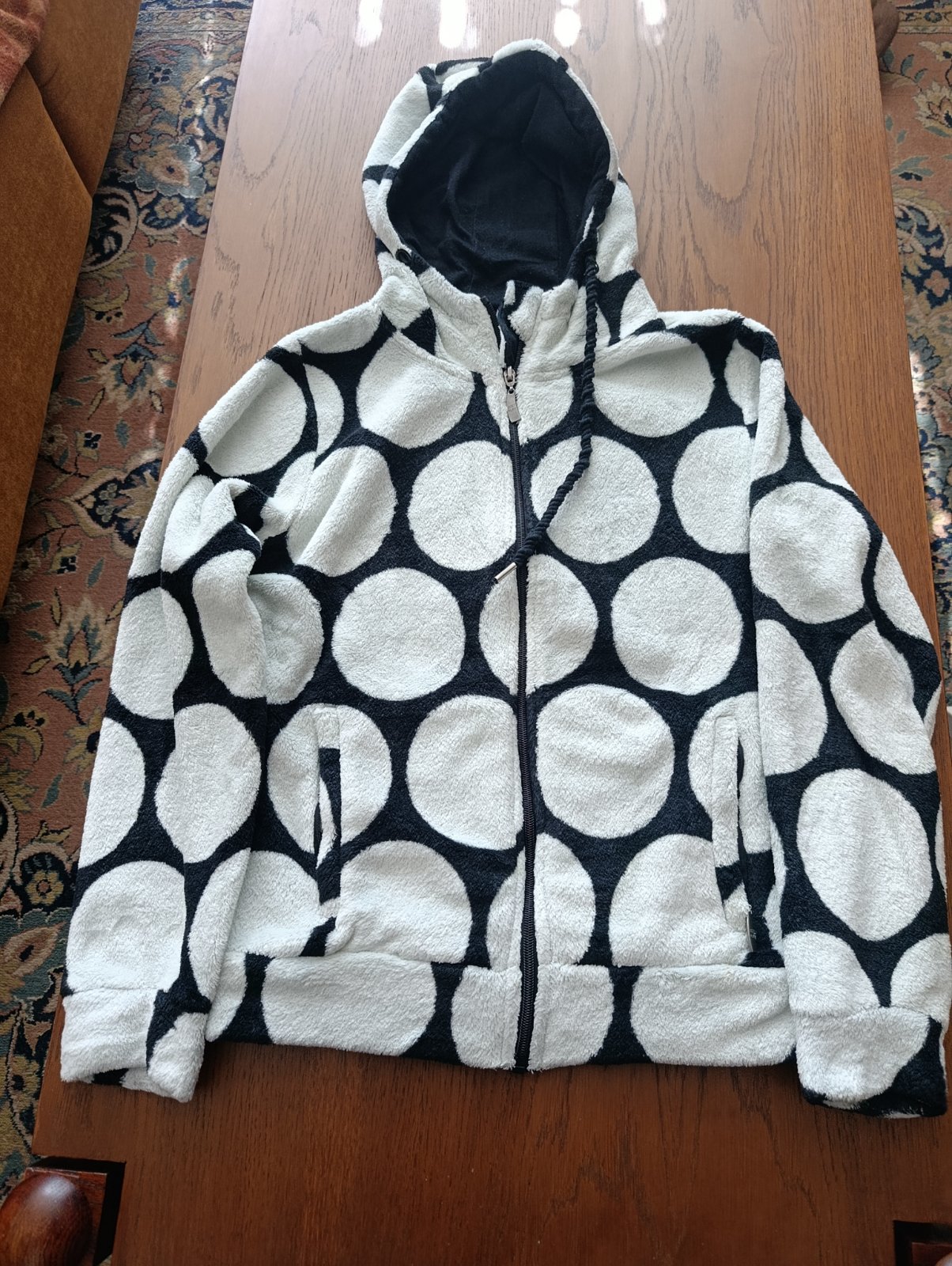 Dĺžka od ramena pri kapucke cca 61cm, rukáv od krku cca 66cm, šírka pod pazuchami cca 48cmx2.