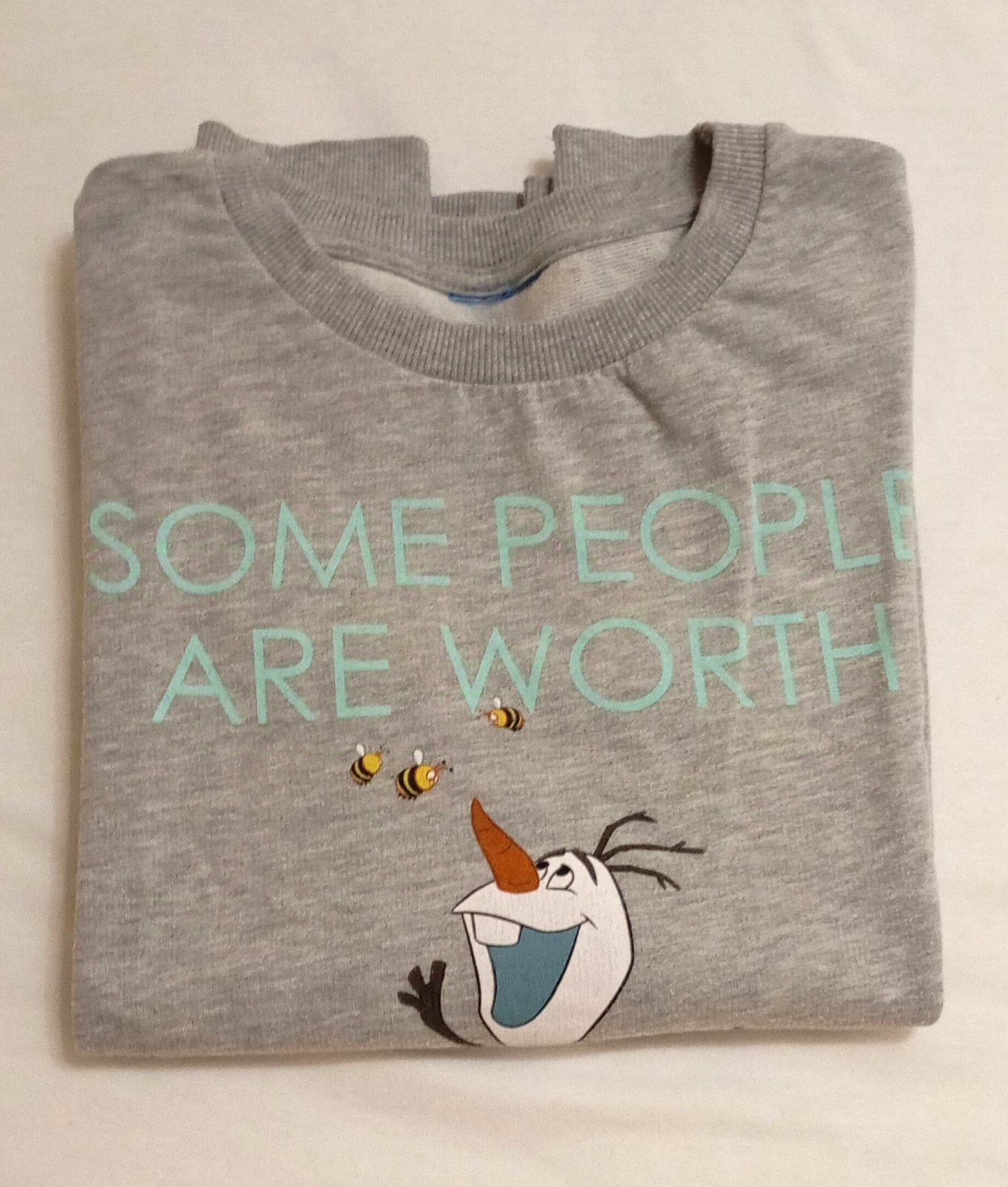 Svetlosivý sveter resp. mikina s motívom snehuliaka Olafa, jednej z postáv filmovej séfie Frozen (Ľadové kráľovstvo) od Disney.