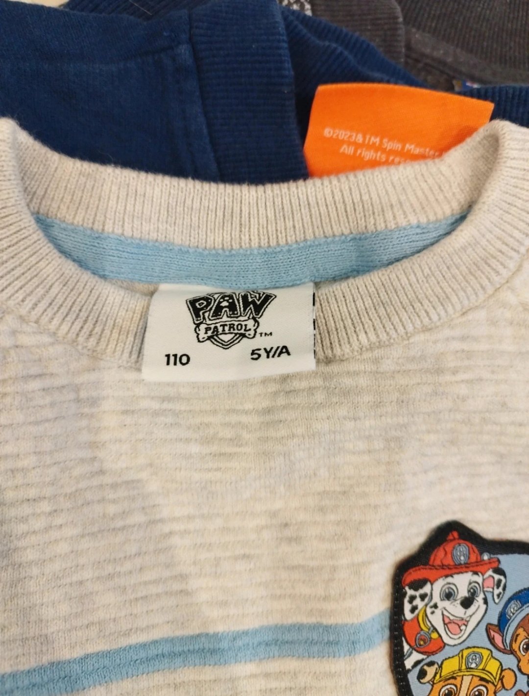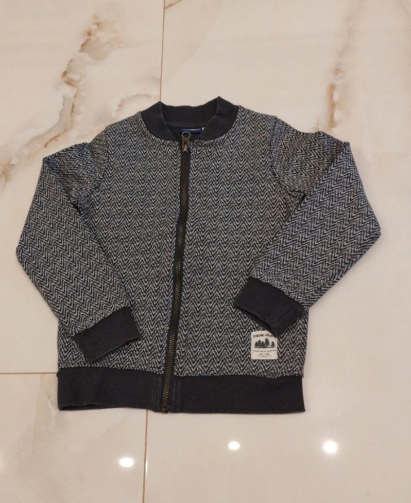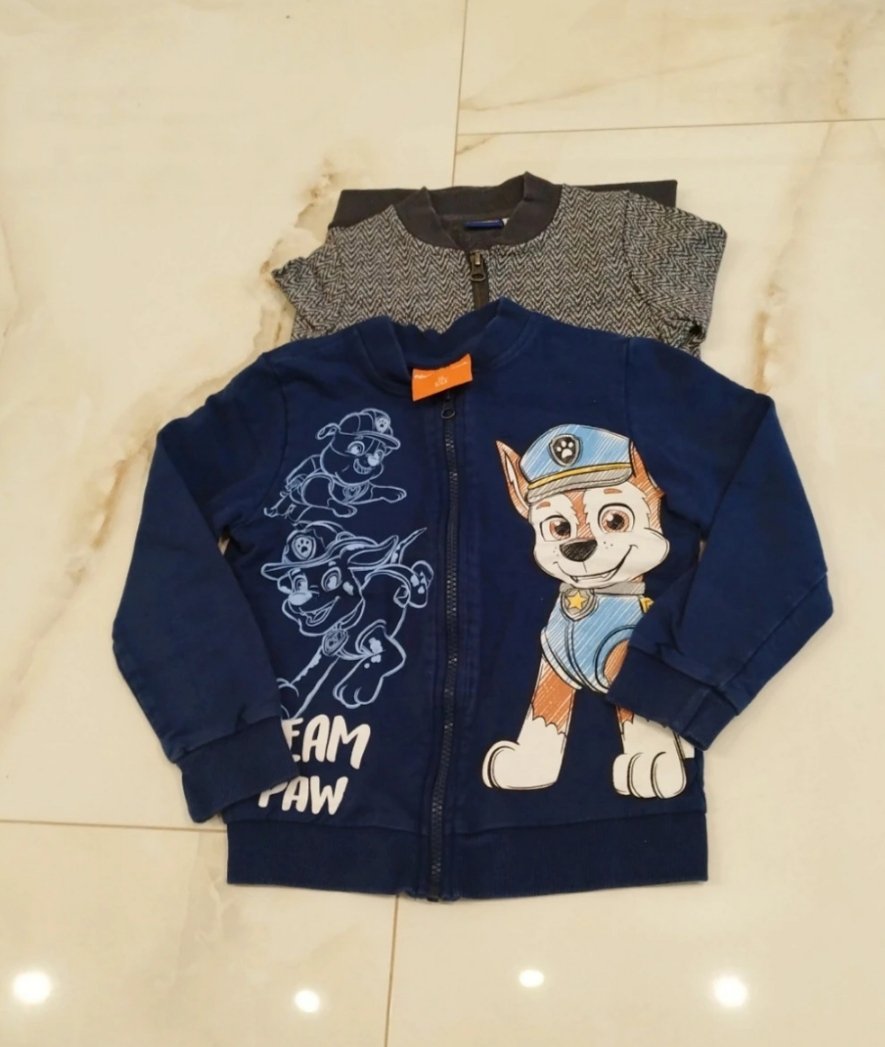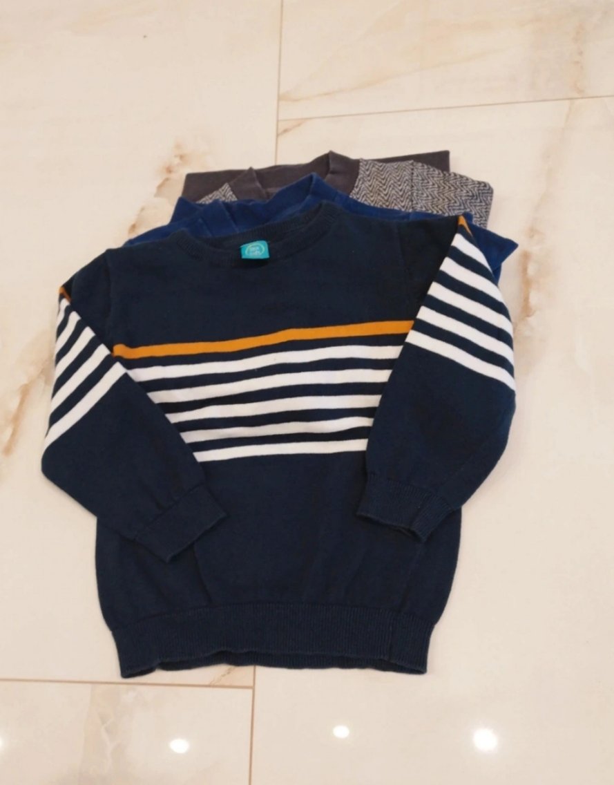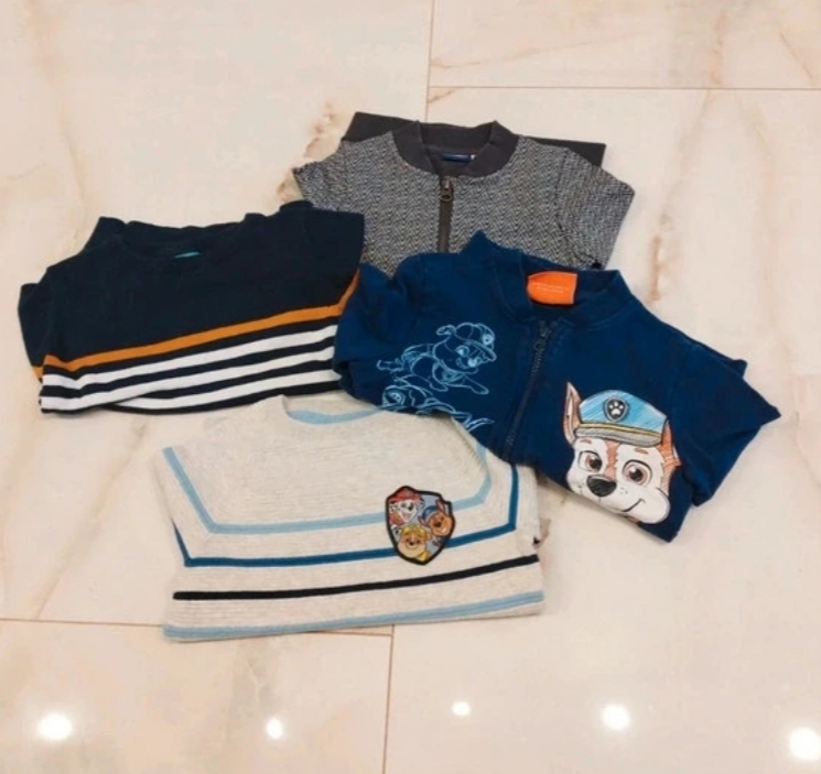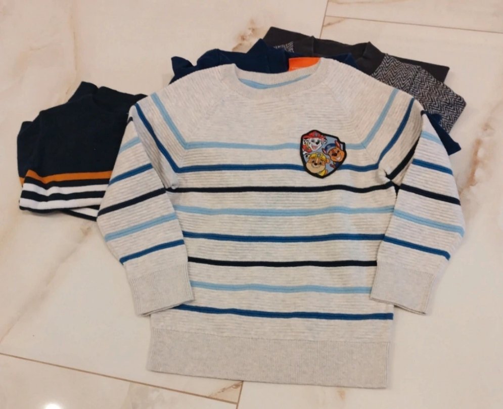 Chlapcenske mikiny 2x a svetriky 2x. Modra mikina nosena najviac. Pasikavy svetrik biely obleceny len 1x. Velkost 110