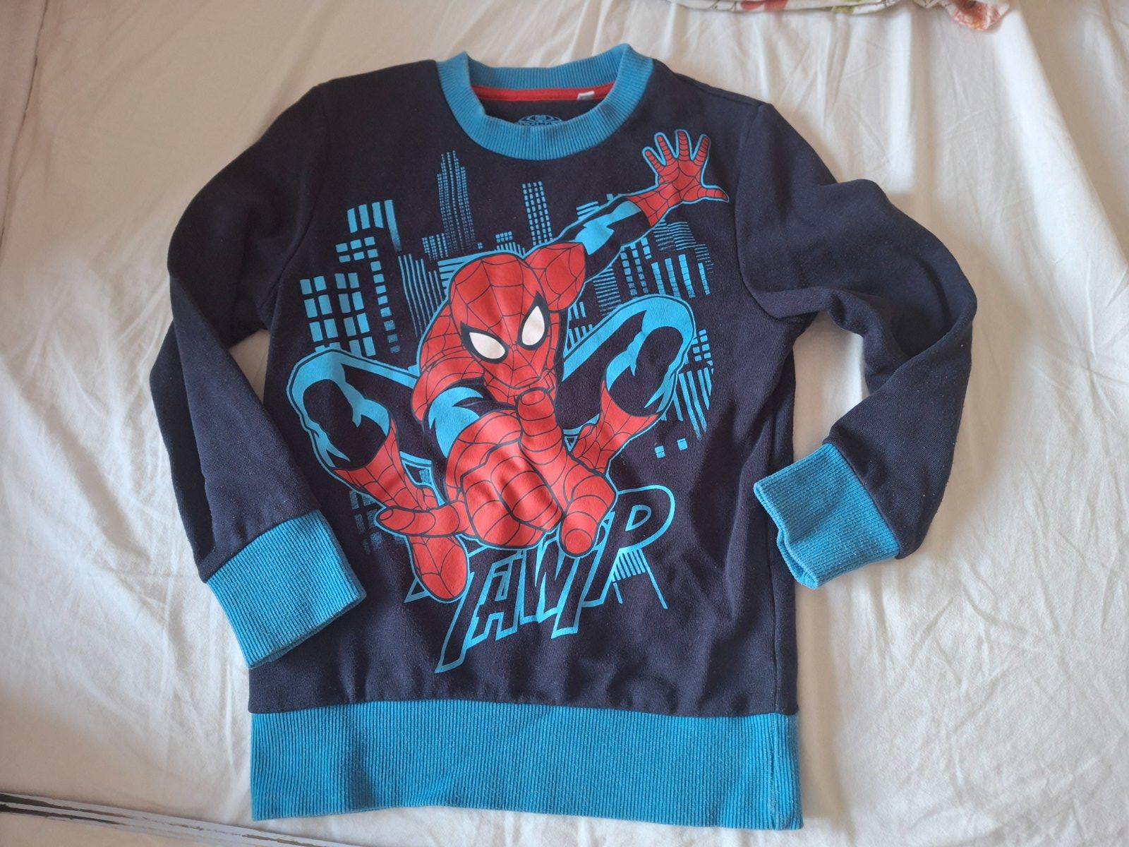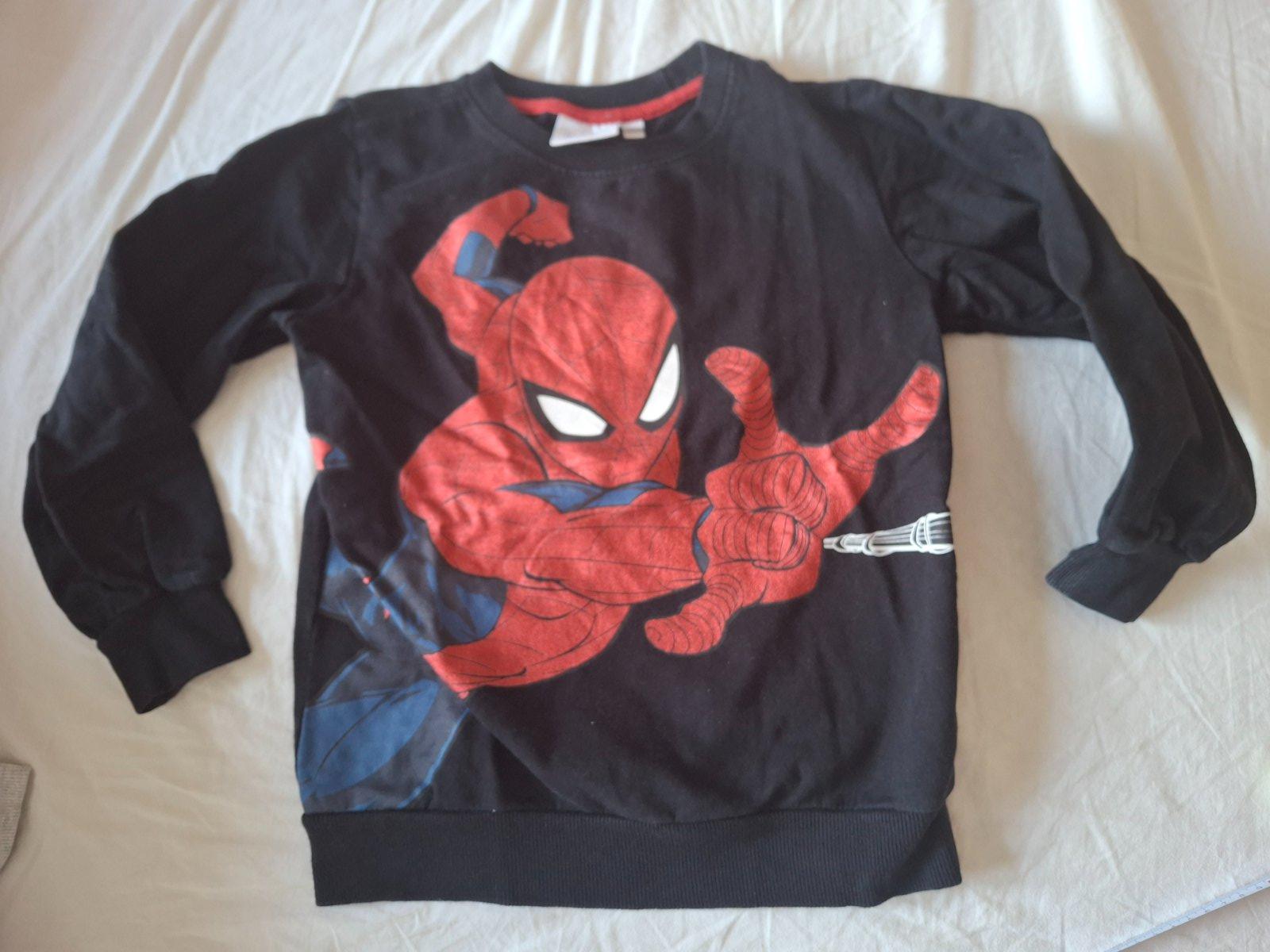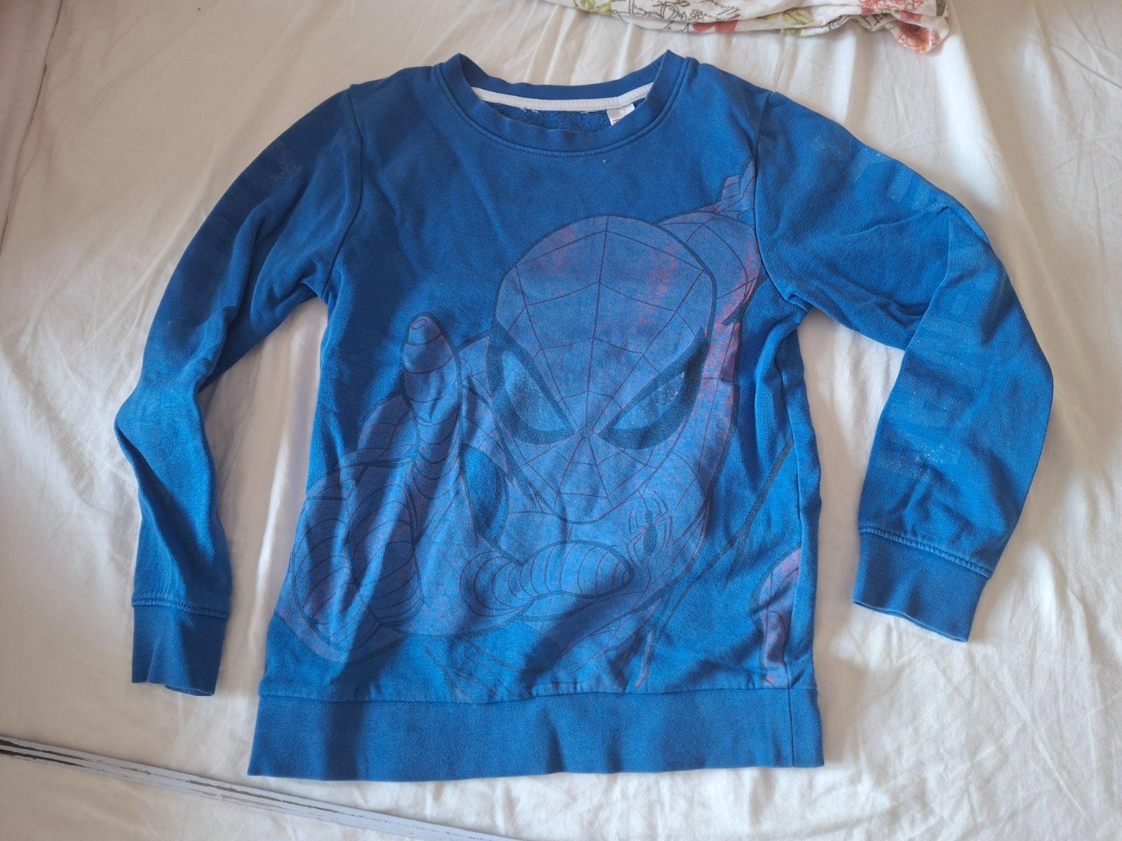 Jedna tmavomodrá mikina so Spidermanom má zošúchaný obrázok.