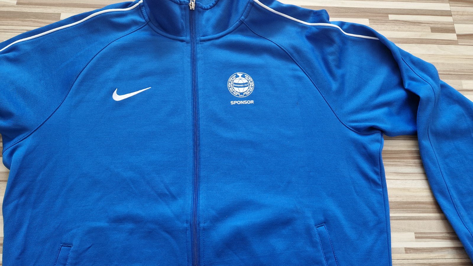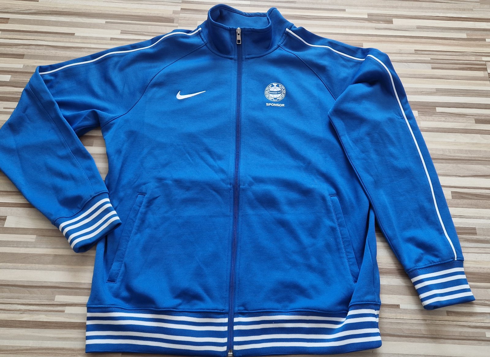 Nike panska mikina, nosena, v dobrom stave, akurat dole ma taky pasik-viď posledná foto, ked bola poskladana, pri noseni to nie je vidno, velkost L, cena 11,50 E,