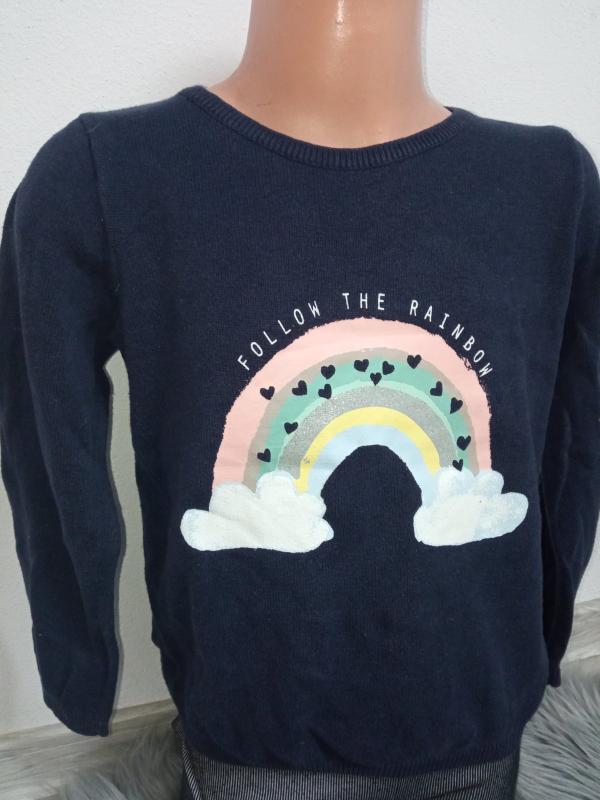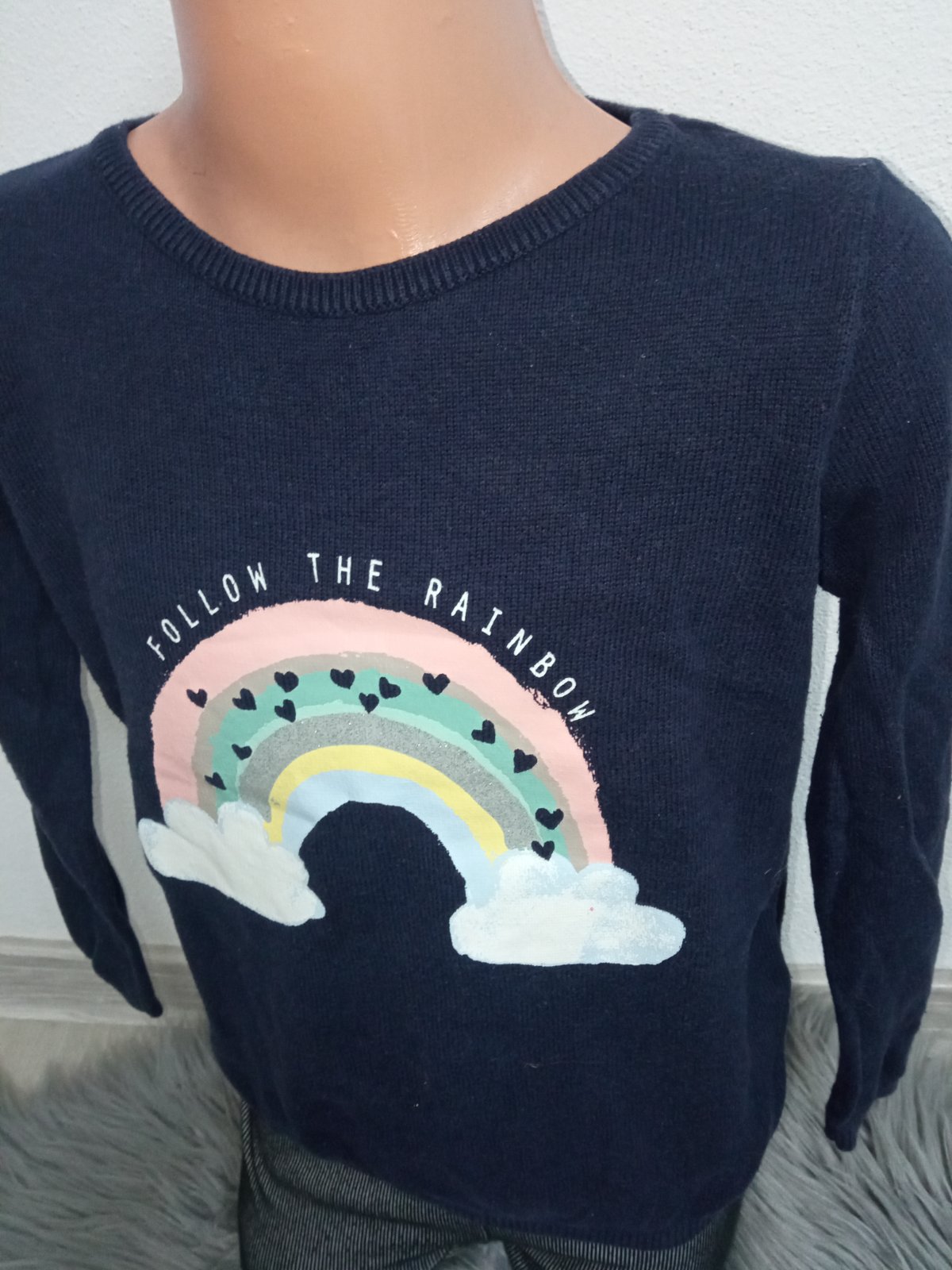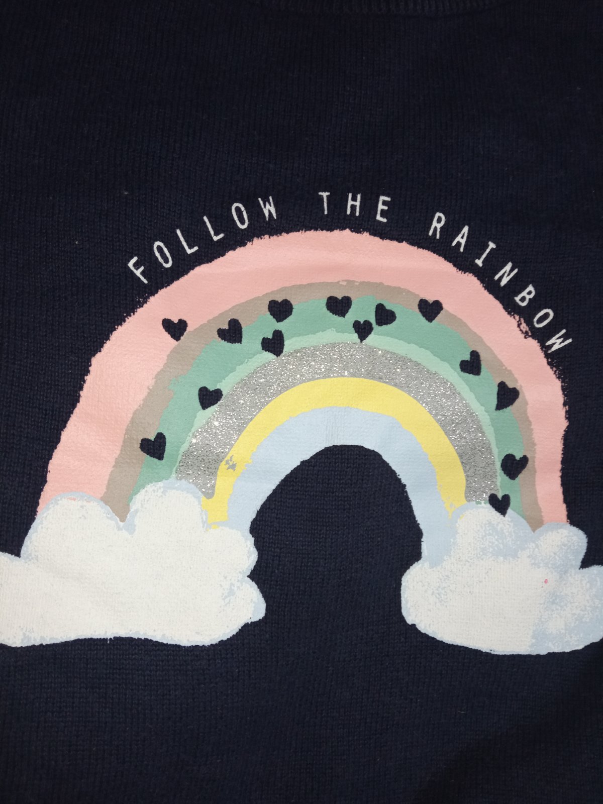 Dievčenský tenký sveter s dúhou, srdiečkami a nápisom. Sivá časť je trblietavá. Okrúhly výstrih. Elastický. Materiál:100%bavlna.