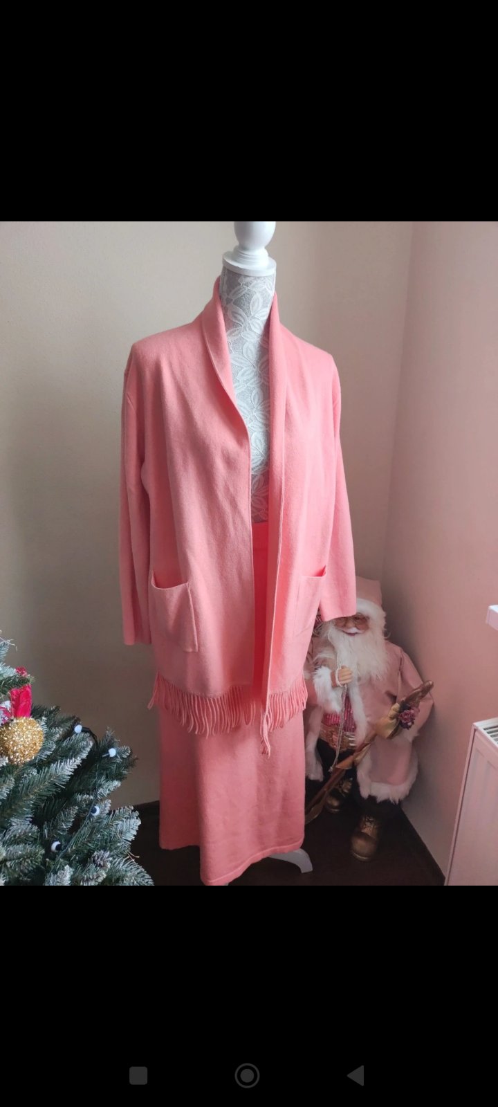 nevymieňam!!nosený,s dvoma vreckami,elastický,má žmolky,farba taká lososová,respektíve pudrovo ružová-pc-25 eur-rozmer-dĺžka 85cm,šírka pod pazuchami 2x69cm,rukáv 55cm,materiál 100% akryl...kuk aj ...