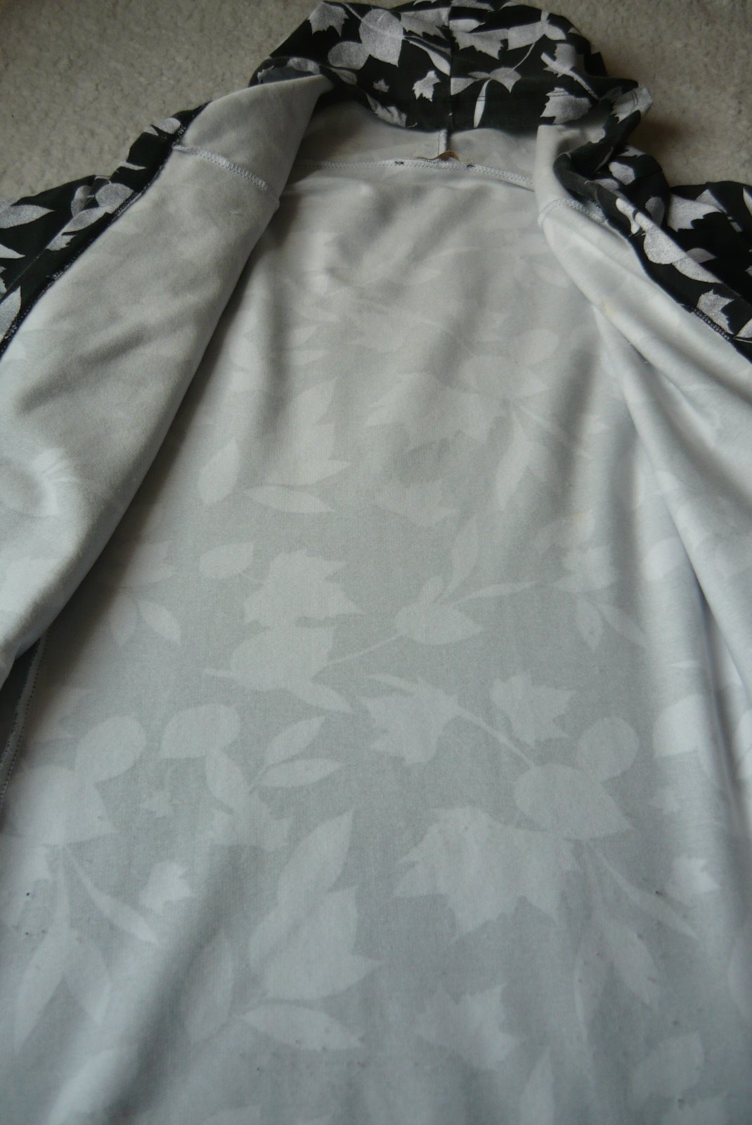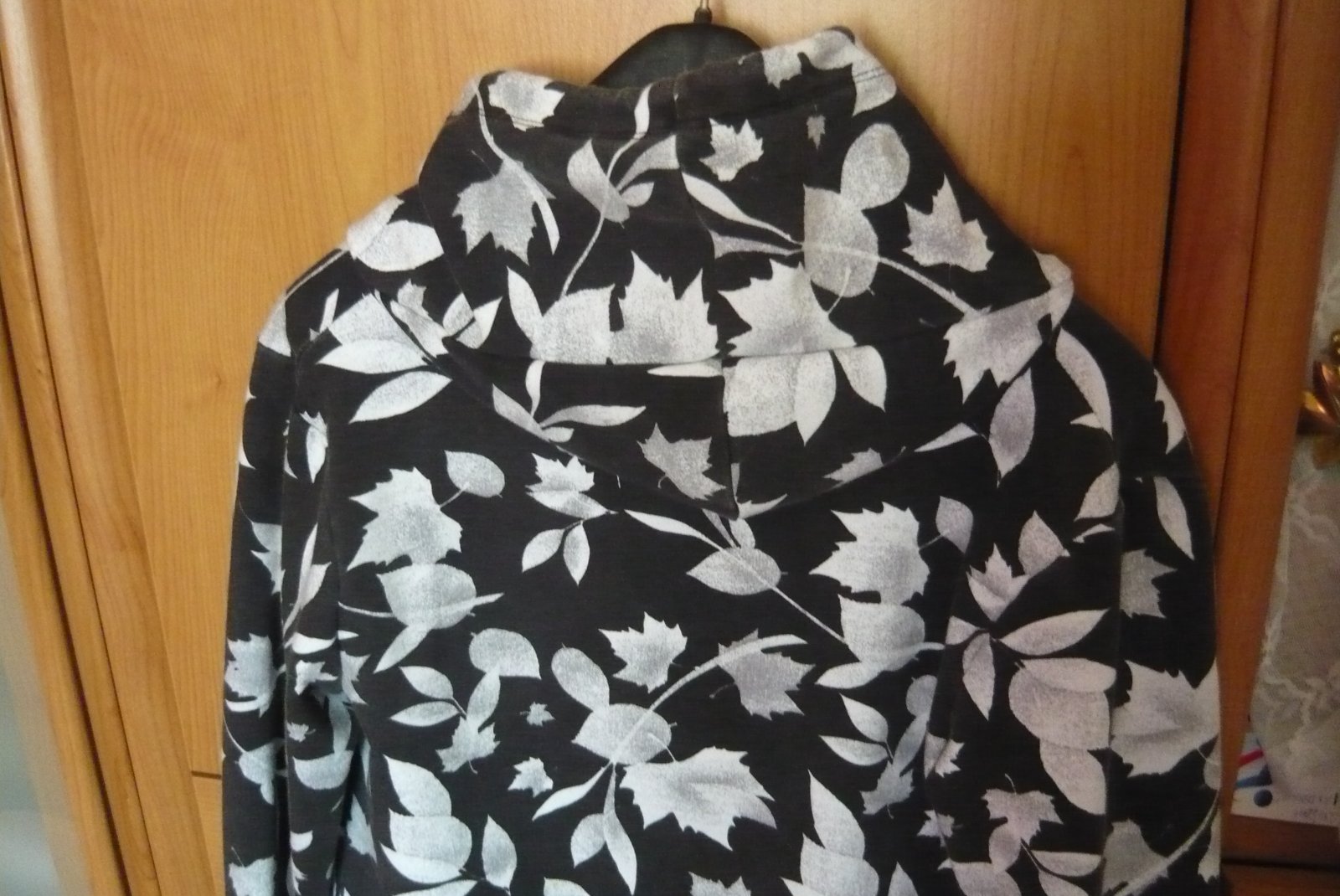 čierno-biela mikina so zapínaním na šnúrky hore z kapuce a dole. Kapuca je napevno, materiál je mäkučký, lahký. Vpredu sú 2 hlboké vrecká. Zloženie je 70 % bavlna, 5% Spandex 25 % polyester. , značka : Free Styll. Univerzálna veľkosť.Cena 9 eur