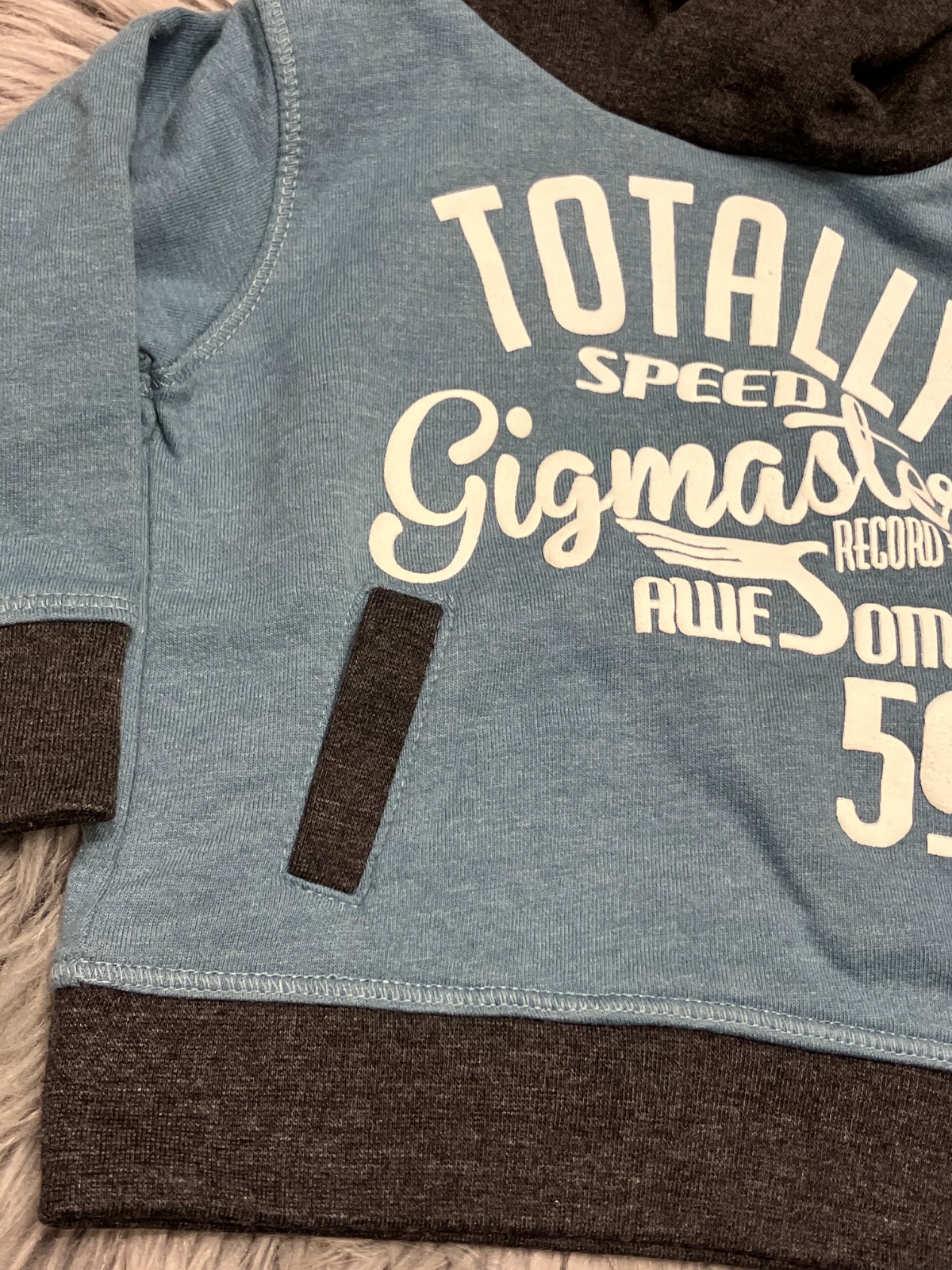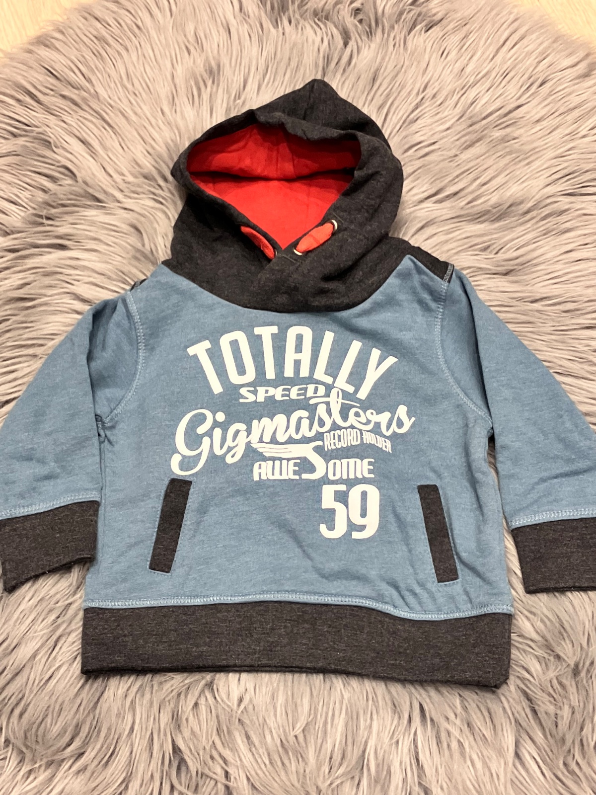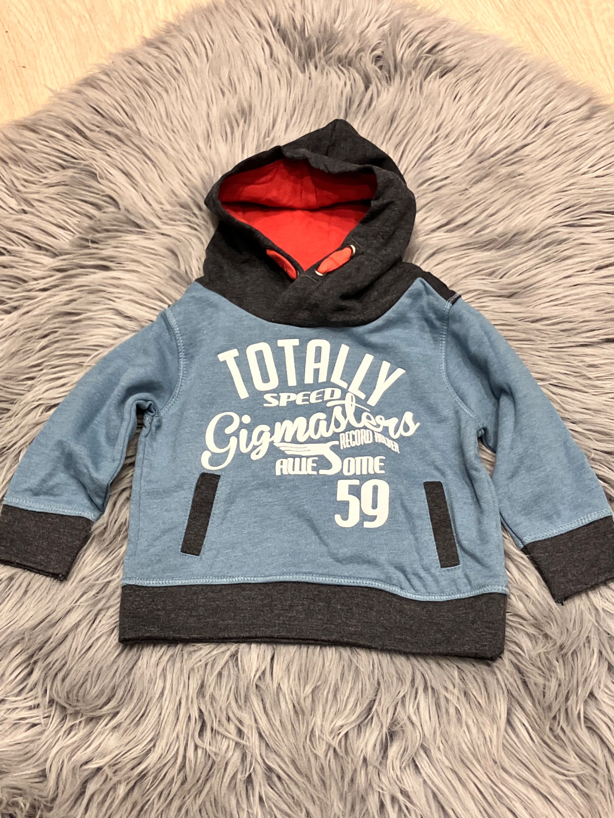 Chlapčenská mikina s kapucňou a nápismi, vo vnútri jemný flís, klokanie vrecko, elastická, materiál 50%bavlna 50%polyester.
