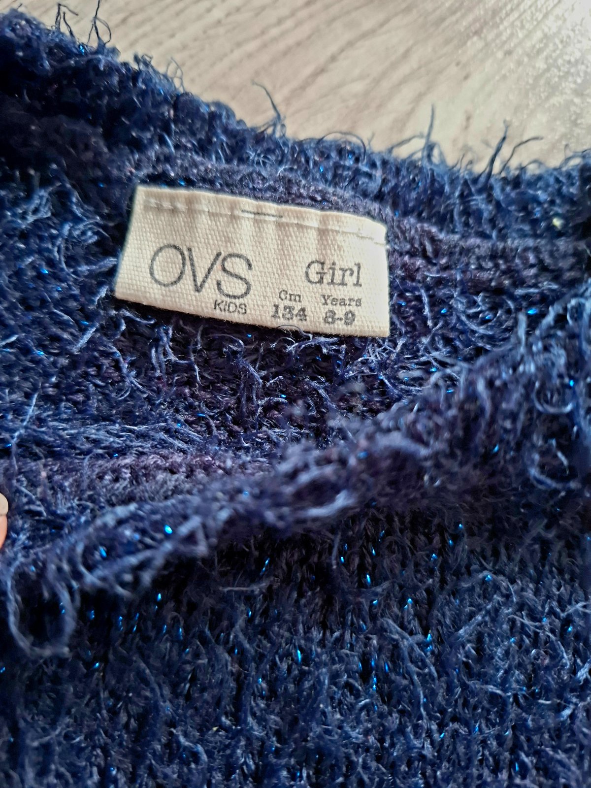 Krásny chlpatý svetrik tmavomodry s bledomodrym trblietkavým prešitím..