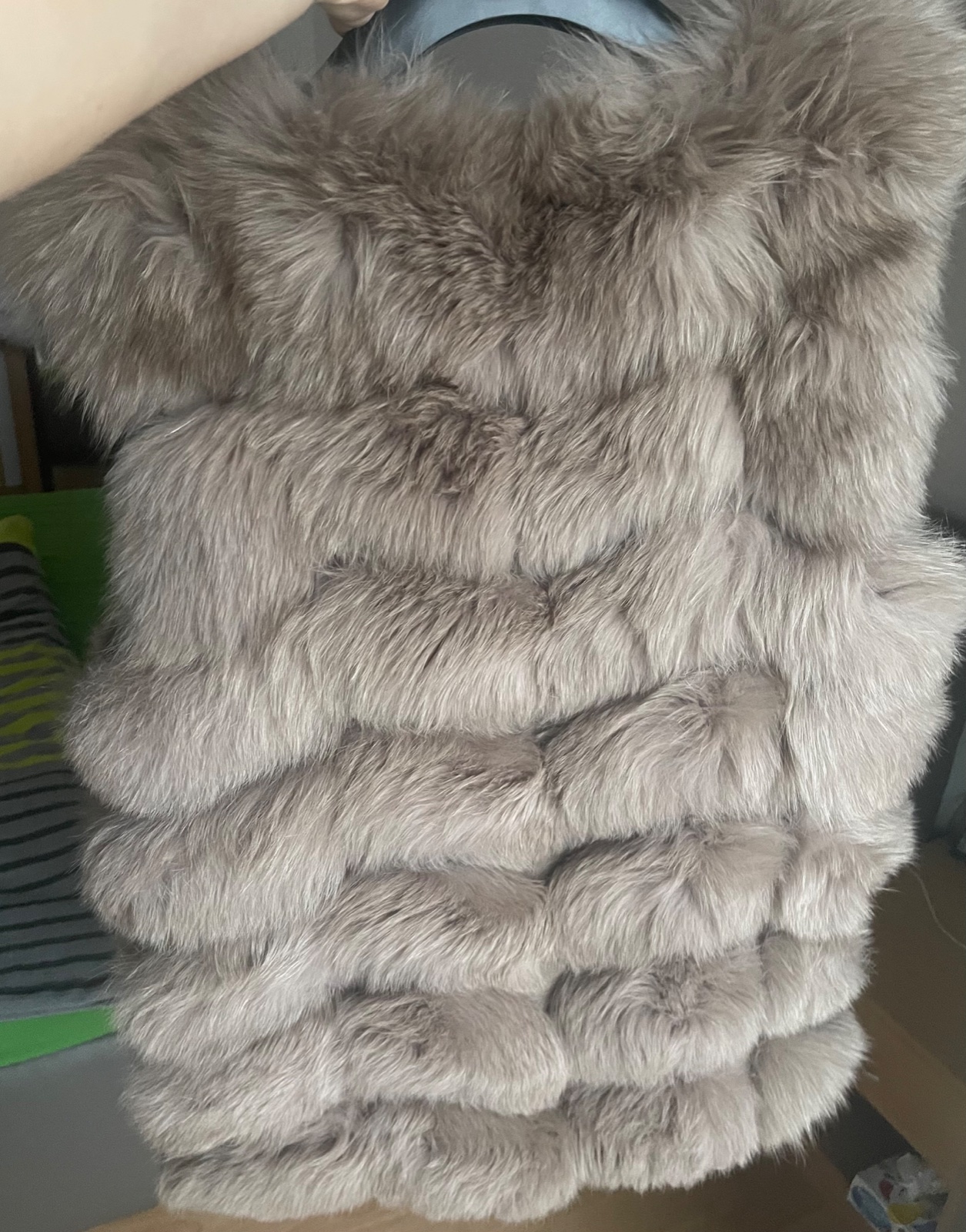Kozusinova vesta z pravej kozusiny. Sadne na velkost M-L. Zapinanie na haciky, bocne kapsy.