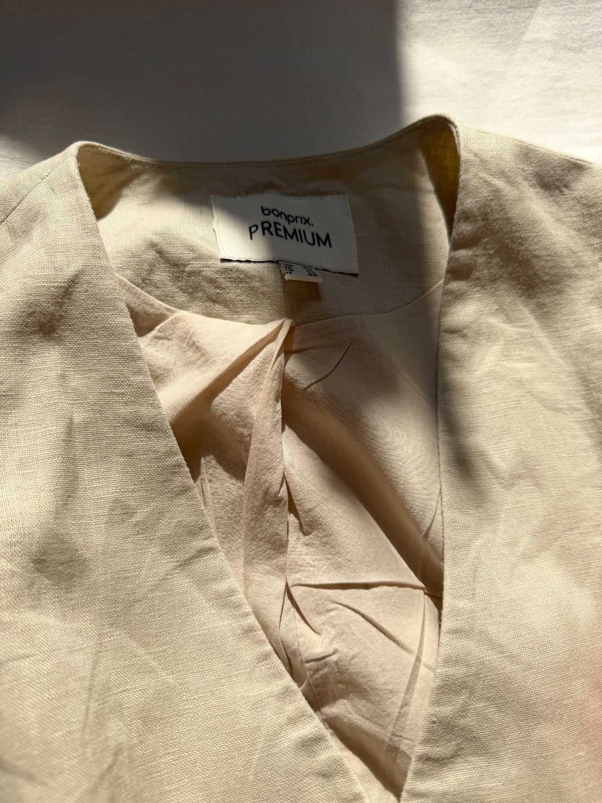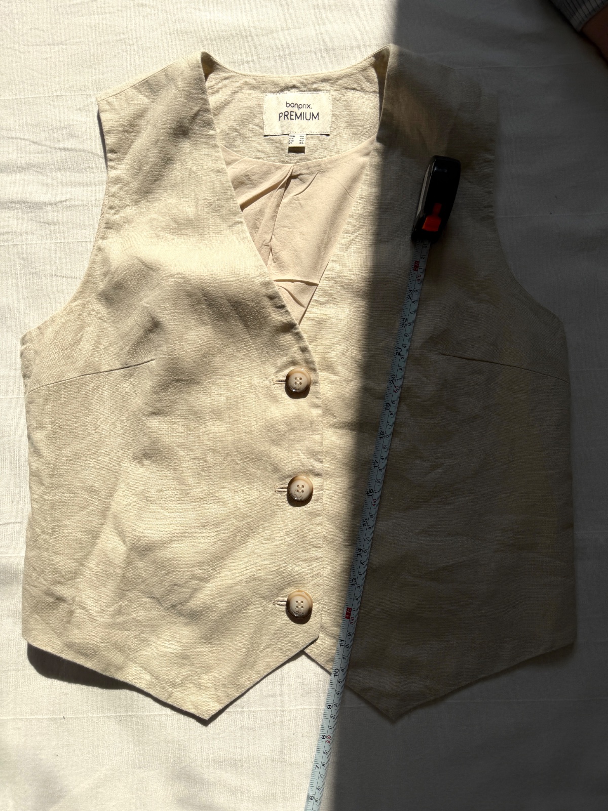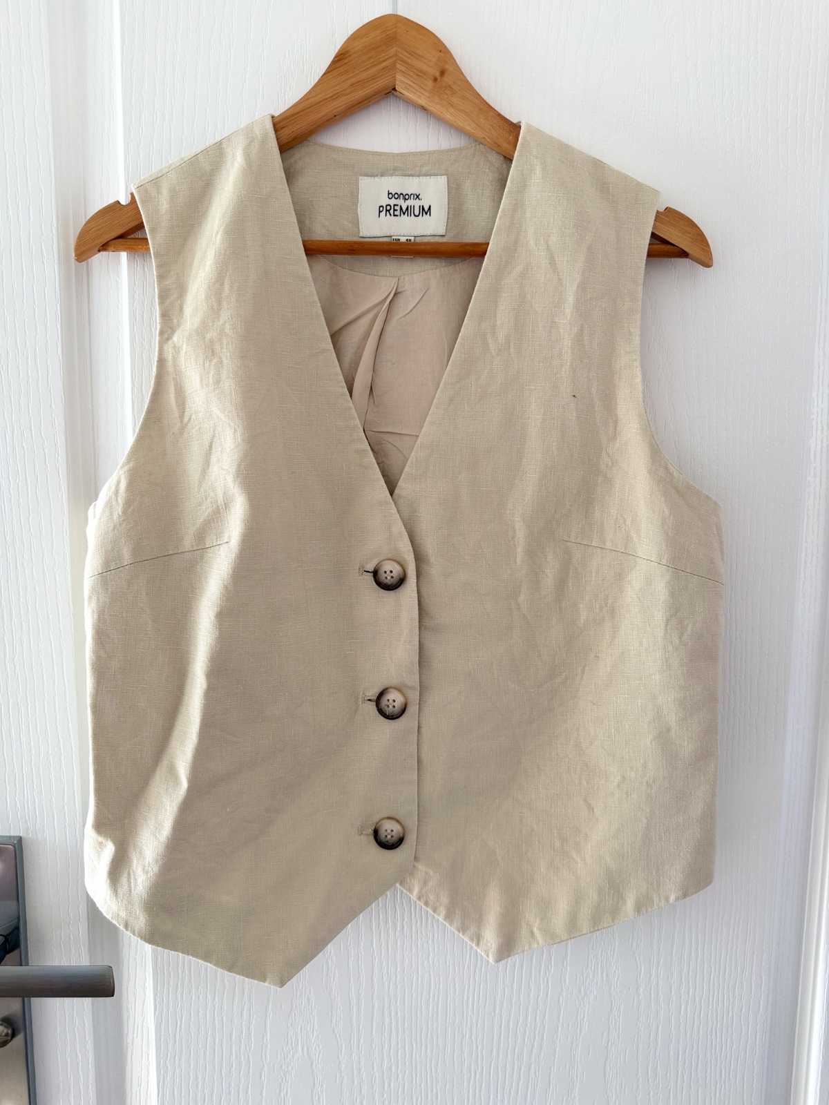 Elegantná, klasická dámska vesta z rady bonprix PREMIUM. Vyrobená zo 100 % prírodných materiálov zaisťuje výnimočné pohodlie, najmä v teplejších dňoch. Má krásny, nadčasový strih. Veľkosť na etikete: 40 EUR; všetky rozmery sú na fotografiách. Je svetlobéžovej/prírodnej farby (pripomína ľan). Zloženie materiálu: 100 % ľan, podšívka 100 % bavlna. Má výstrih do V a jednoradové zapínanie s tromi ozdobnými, tieňovanými gombíkmi. Vpredu má asymetrický výstrih do V a vzadu zvislé záševky pre lichotivú siluetu. Perfektne sa hodí k elegantným outfitom (napr. košeľa a oblekové nohavice) aj k ležérnejším outfitom (biele tričko a džínsy).