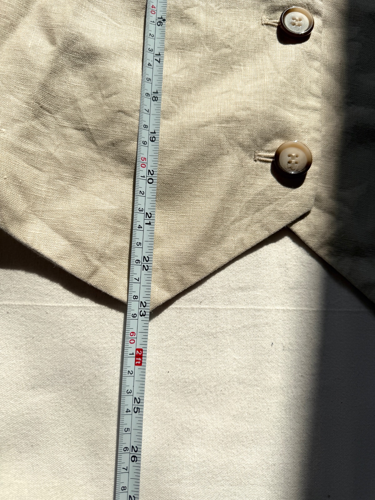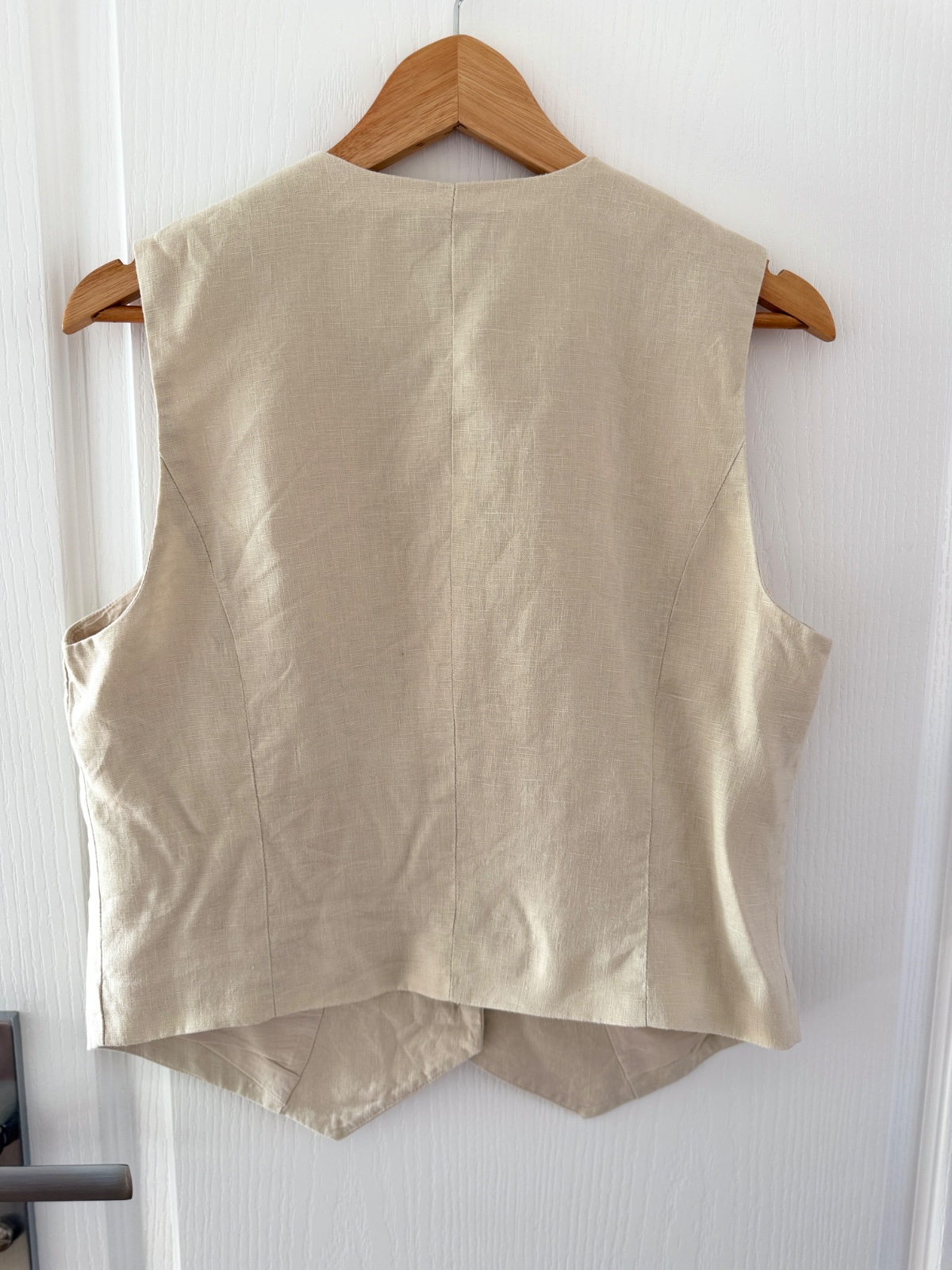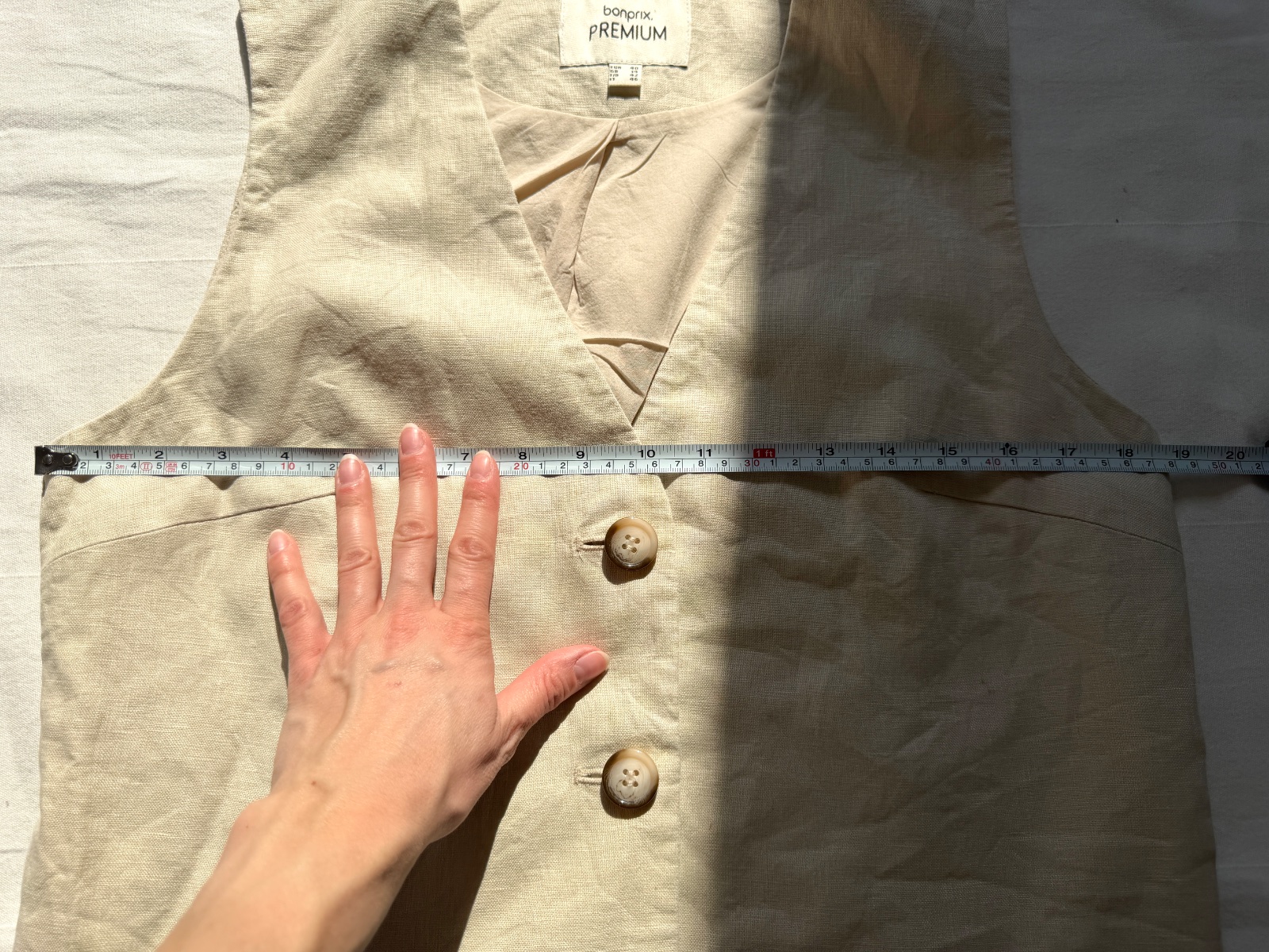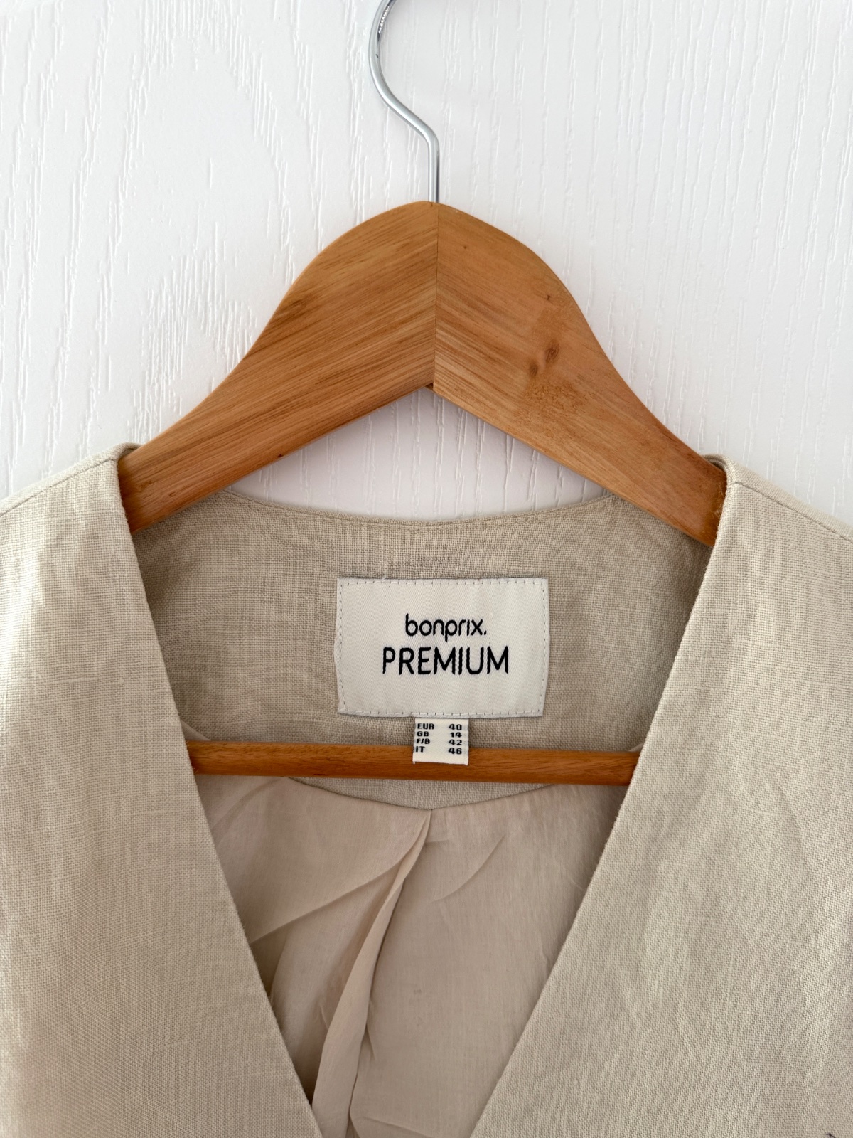 Elegantná, klasická dámska vesta z rady bonprix PREMIUM. Vyrobená zo 100 % prírodných materiálov zaisťuje výnimočné pohodlie, najmä v teplejších dňoch. Má krásny, nadčasový strih. Veľkosť na etikete: 40 EUR; všetky rozmery sú na fotografiách. Je svetlobéžovej/prírodnej farby (pripomína ľan). Zloženie materiálu: 100 % ľan, podšívka 100 % bavlna. Má výstrih do V a jednoradové zapínanie s tromi ozdobnými, tieňovanými gombíkmi. Vpredu má asymetrický výstrih do V a vzadu zvislé záševky pre lichotivú siluetu. Perfektne sa hodí k elegantným outfitom (napr. košeľa a oblekové nohavice) aj k ležérnejším outfitom (biele tričko a džínsy).