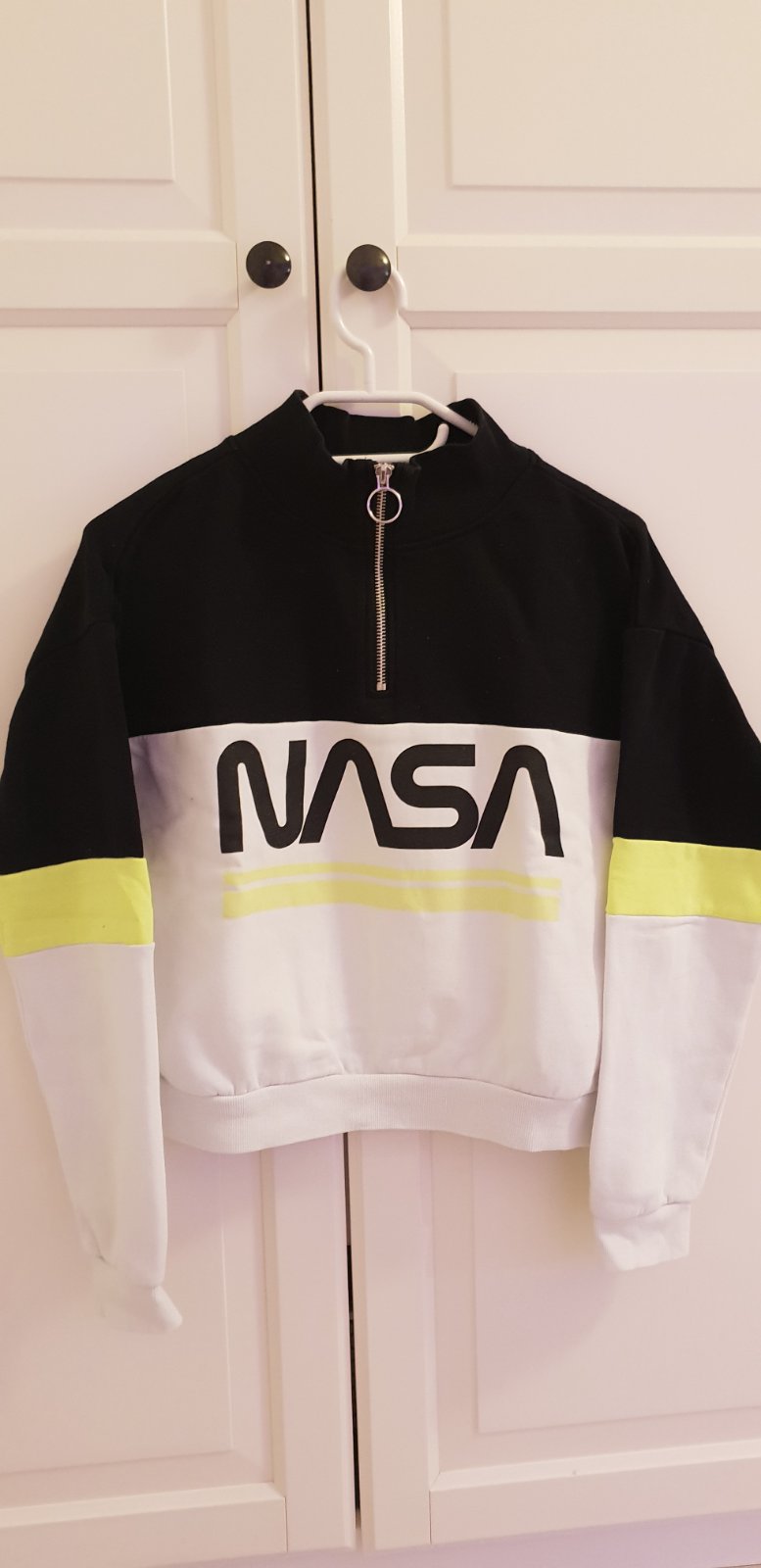 Pekná svetlá farba s trblietavý mi nápismi aj pretkané trbliet.nitami na patentoch, s vreckami. Naša obľúbená. Veľkosť 158/164. Dlhšia na boky. V prípade záujmu a potreby premeriam