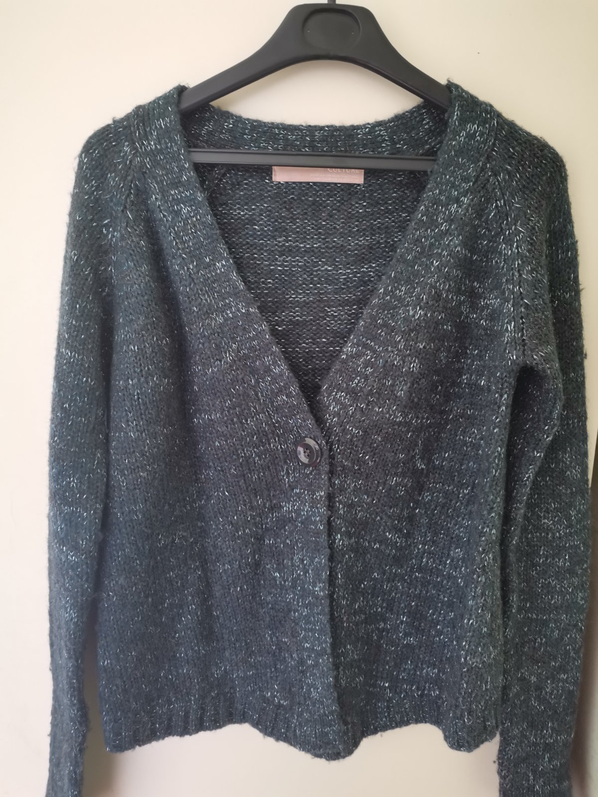 Kardigán s pútavou aplikáciou sovy z okrúhlych nitov, vpredu zapínanie na 1 gombík, raglánové rukávy, farba melírovaná šedo-petrolejová s lesklým tyrkysovým vláknom.