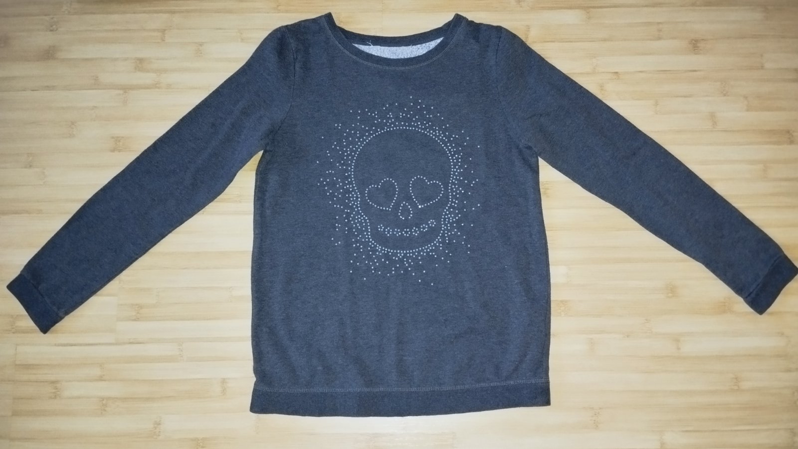 Predám teplákovú mikinu tmavej šedej farby s kresbou tvére dievčaťa. Je nosená, ale v dobrom stave bez poškodení, len má žmolky. Veľkosť asi 158, Rozmery: celková dĺžka od ramena po spodok - 56 cm...