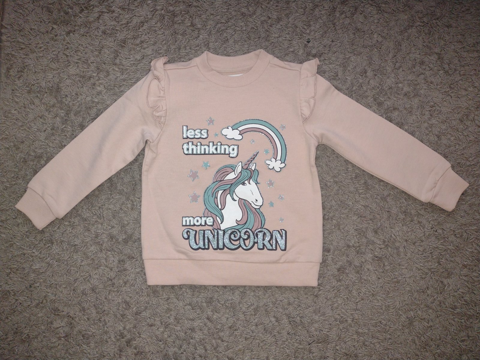 Tenšia mikina bielej farby s farebnými fľakmi v leoparďom vzore, k tomu teplejšia mikinka v staroružovej farbe, s flitrovou aplikáciou jednorožca. Obe nosené málo, výborný stav, veľkosť 110.