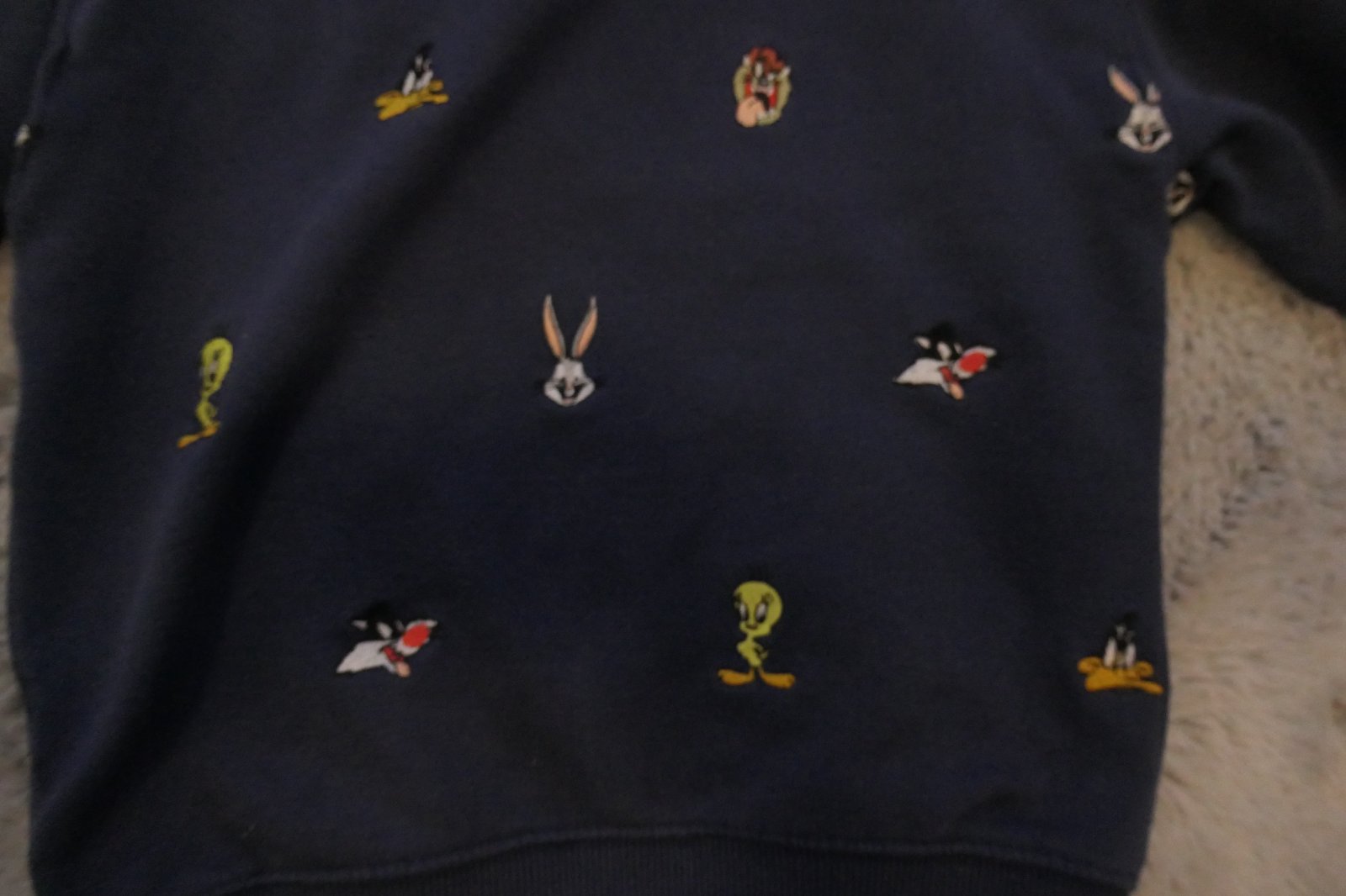 minimalne nosena, v super stave, len ne jenom rukave ma maly fliacik, pri noseni ani nevidiet na 1,2 foto na rukave pri patente, PC vysoka, aplikacie nasivane po celej ploche postavicky looney tunes