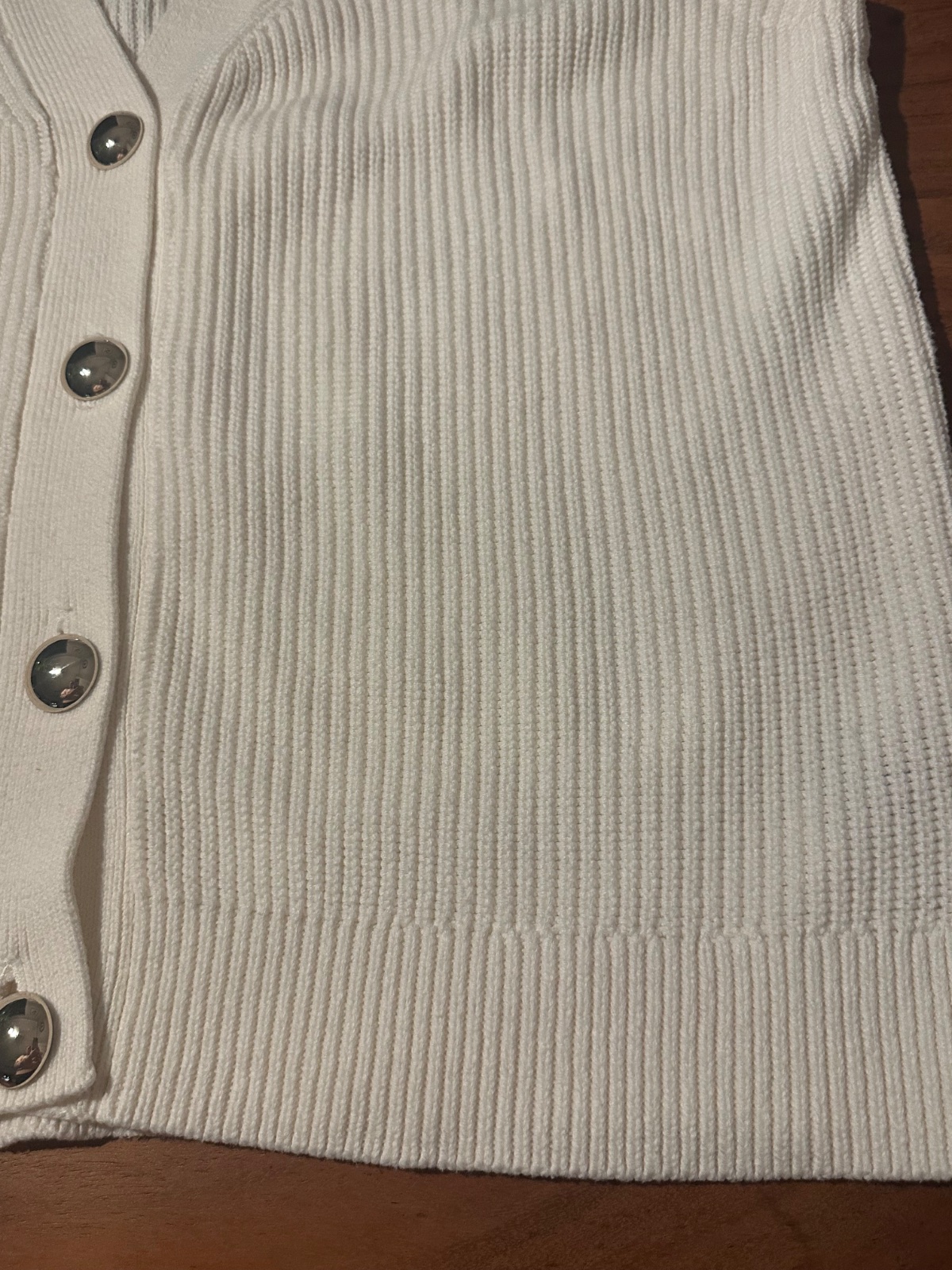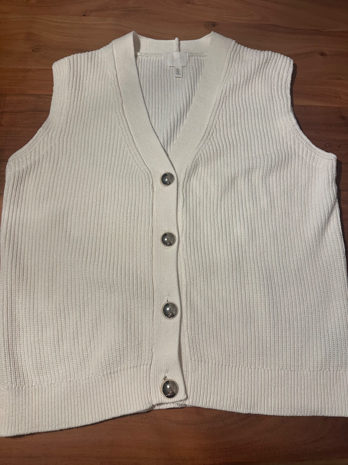 Klasická vesta, pletený vzhľad, smotanový odtieň. Materiál 60% bavlna, 40% akryl, zapínanie na zlaté gombíky. Dĺžka 66 cm, šírka hrudník 2 x 60 cm. Bez visačiek, len odskúšaná. Top stav.