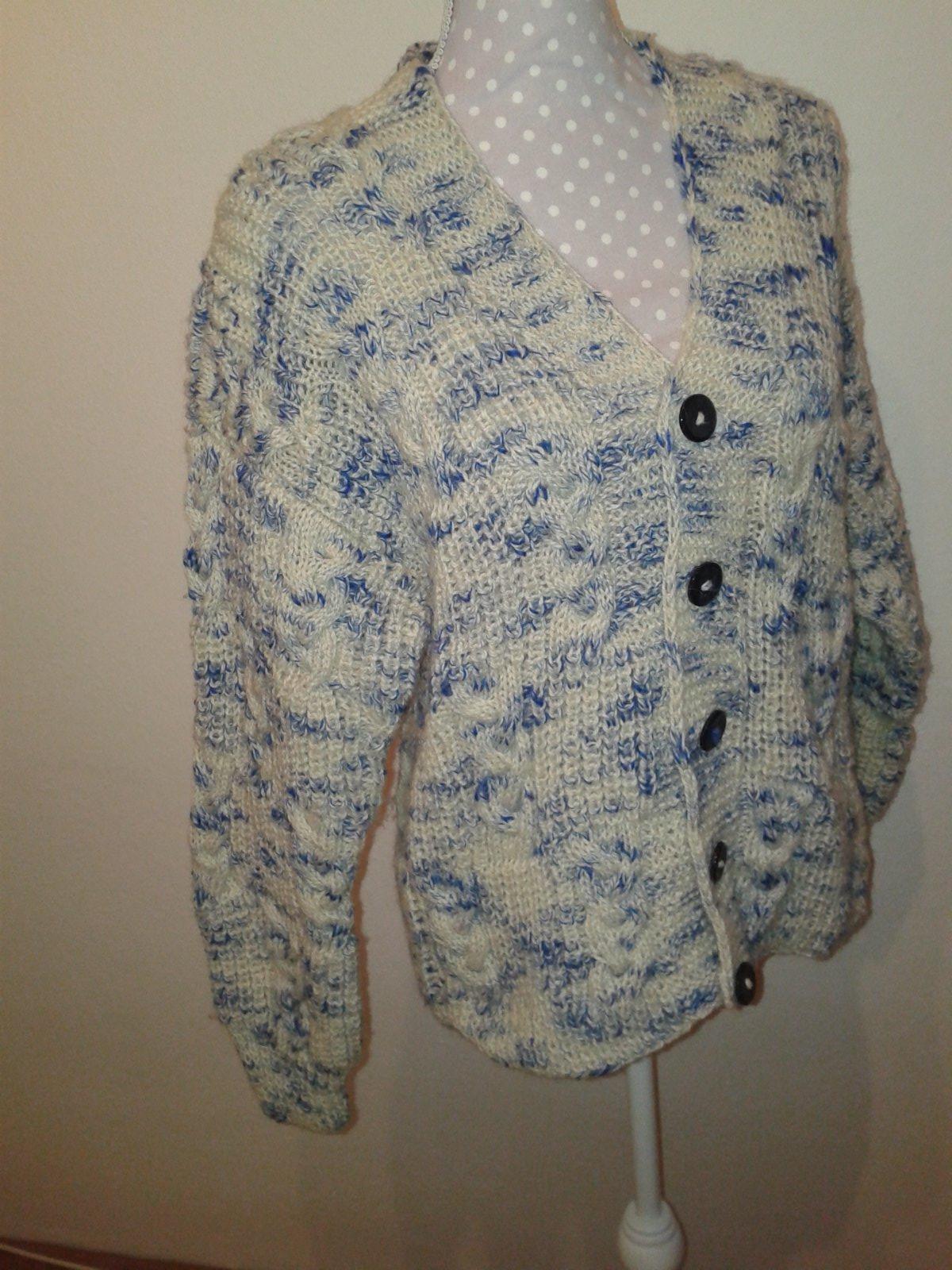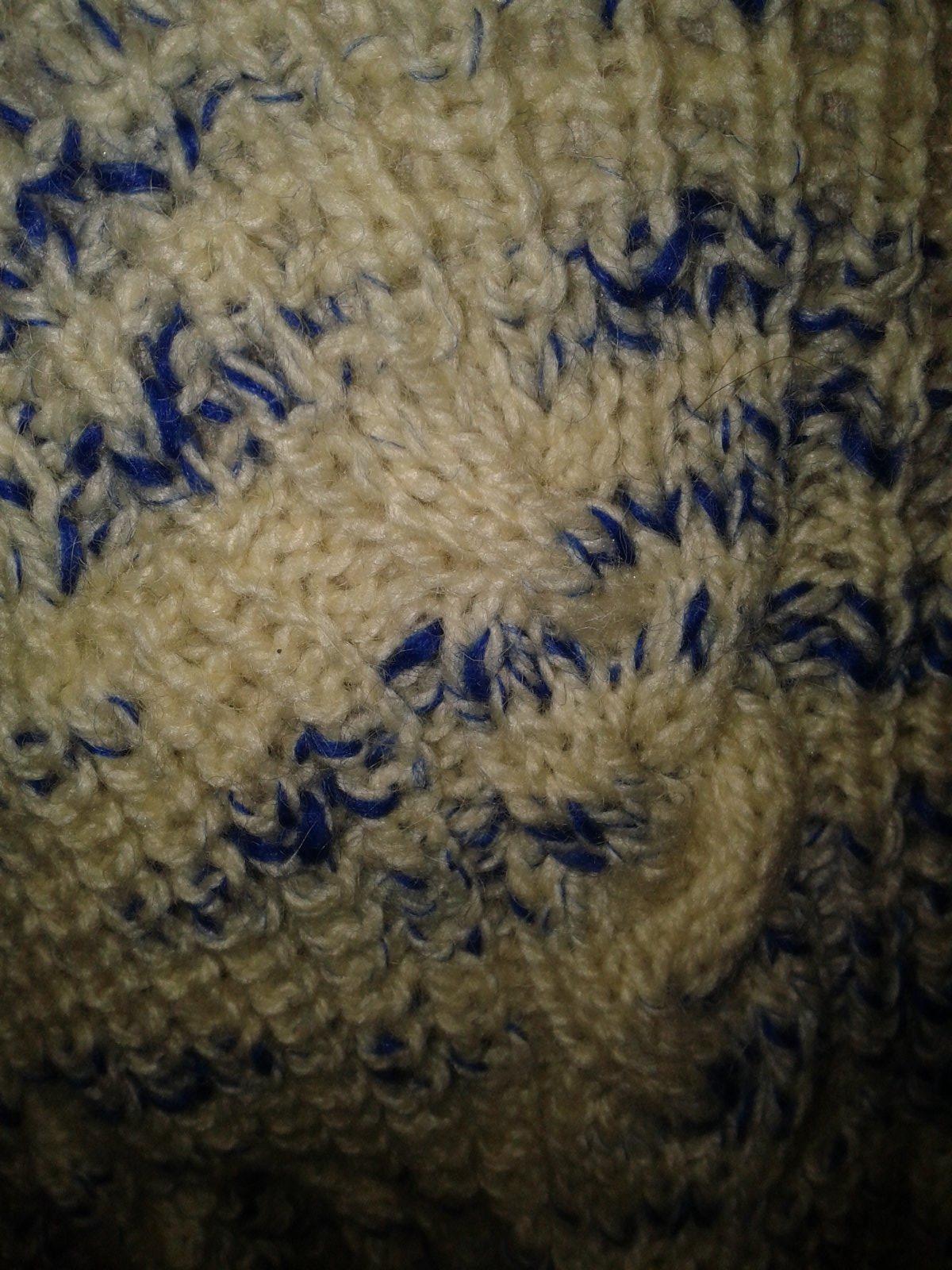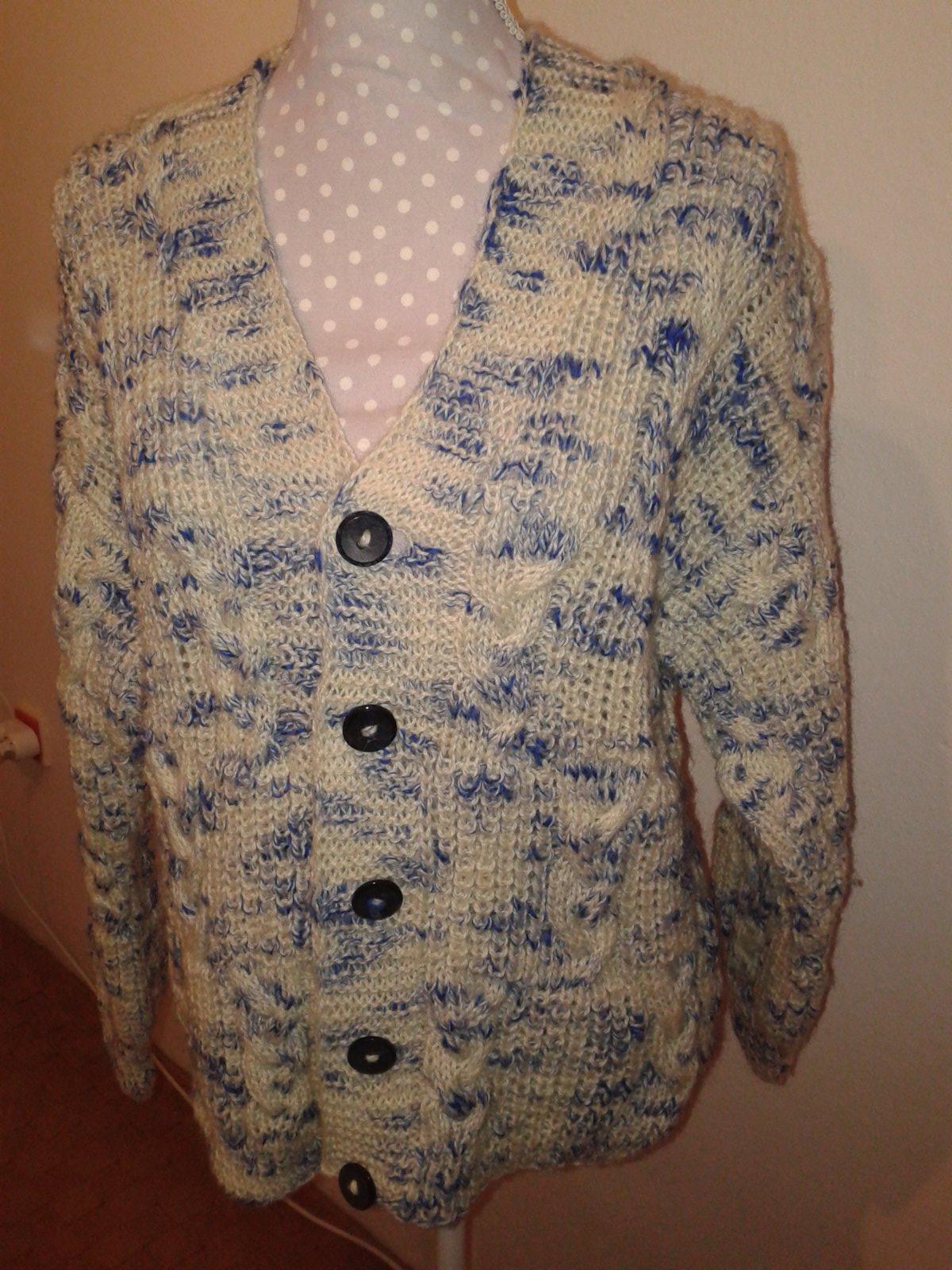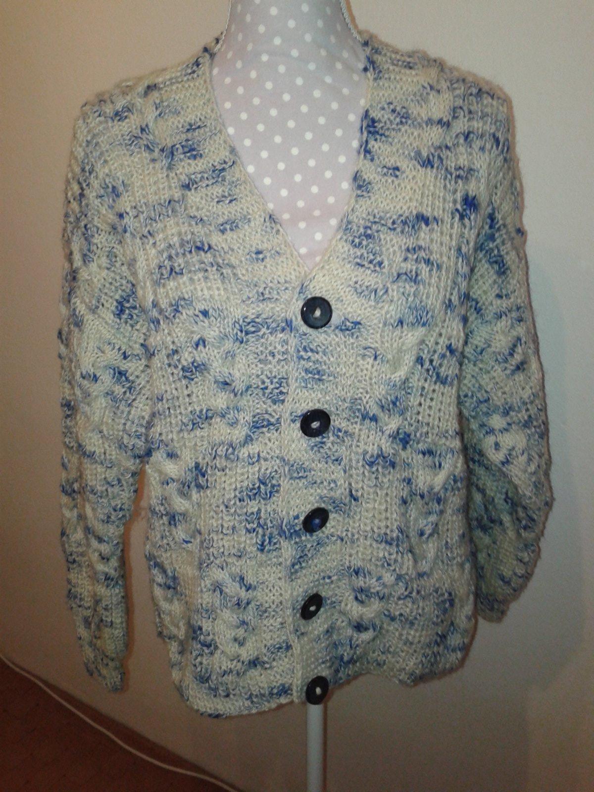 ručne pletený osmičkovým vzorom , nie je to vlna, je to syntetická prskaná priadza, asi 2x oblečený, dlžka 57 cm, rukáv od krku 69, šírka cez prsia 53x2 ...všetko merané v kľude...ešte popustí,