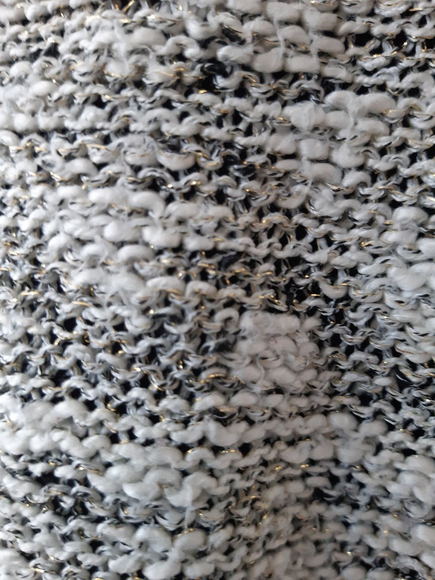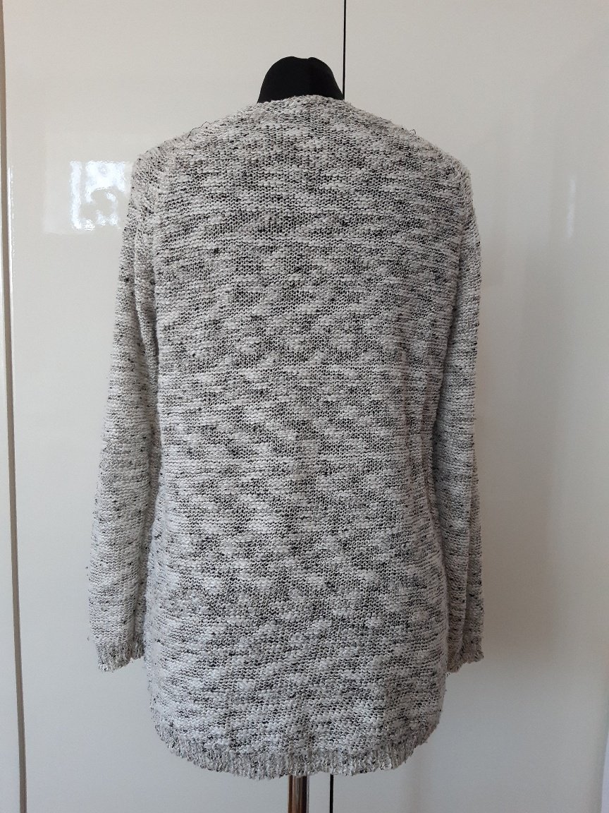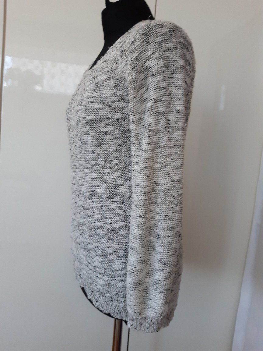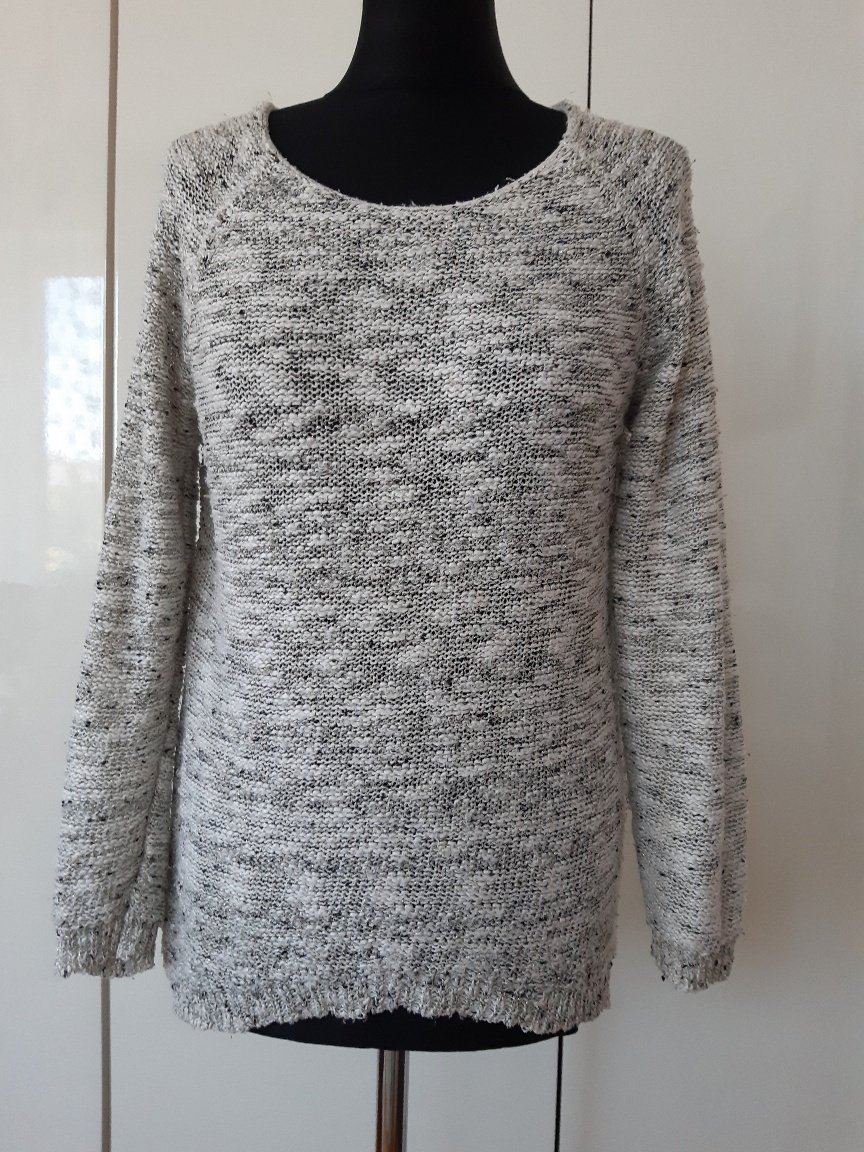 Pulóver ako pletenina, dl. 70 cm, dl. rukáva od krku- je to reglán - 66 cm, šírka cez prsia 4áx2 cm. Pulóver má trochu žmolky, vyzerá, že to bude asi podiel vlny, alebo polyakryl- chýba visačka je tam aj vpletená zlatá nitka. Predný diel je trochu kratší, je v oblúku.