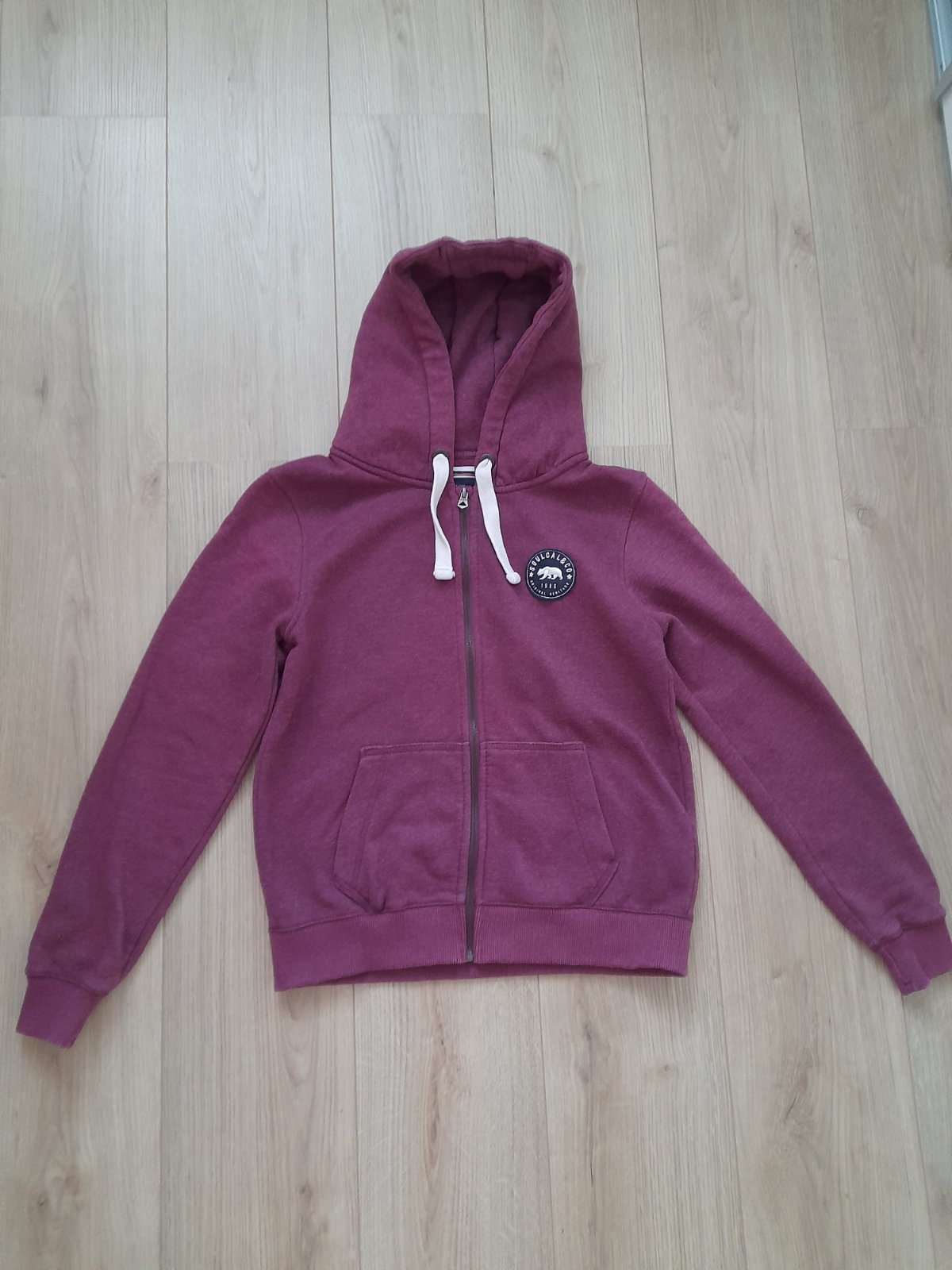 Vínovočervená fleecová mikina vo veľmi dobrom nosenom stave ( bez dierok, fliačikov a žmolkov; sem-tam trčiaca nitka ). Obliekanie cez hlavu, veľký golier s uväzovaním na šnúrky, bez odopínacích pa...