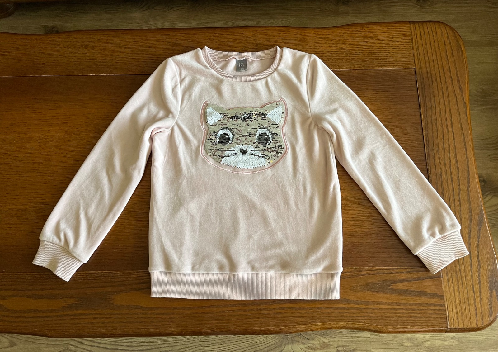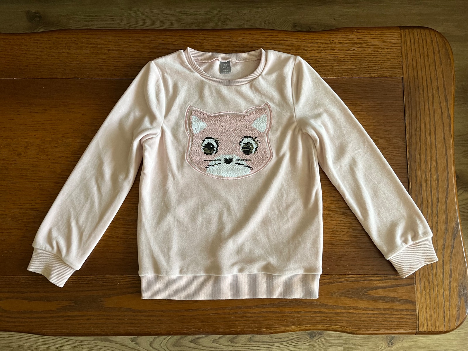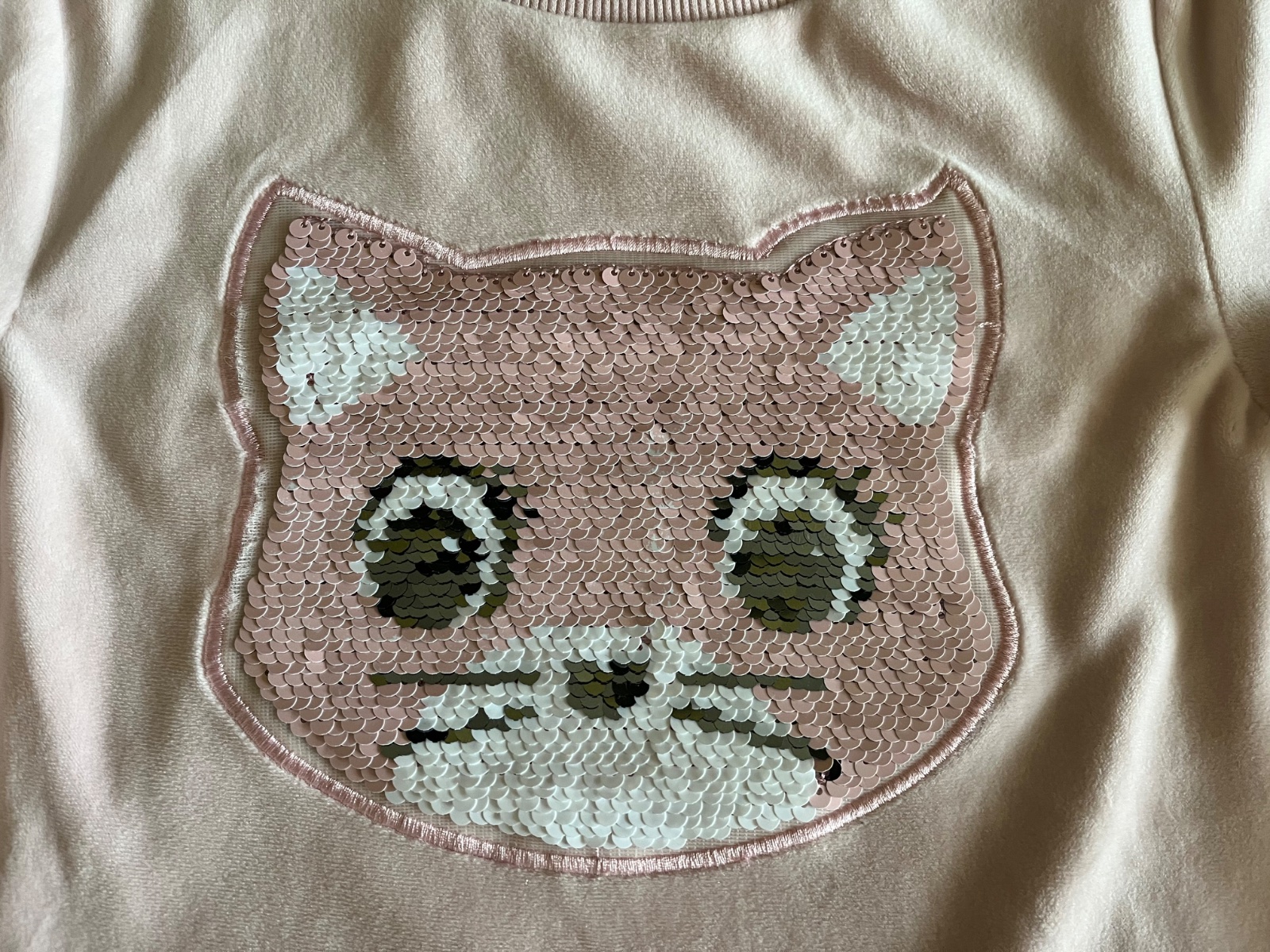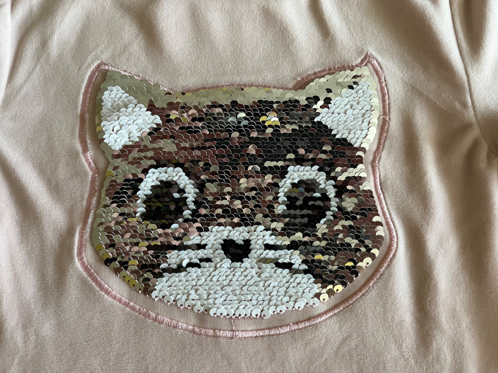 Super stav, párkrat oblečená. Teplučká chlpatka s veľkým interaktívnym premieňacím vzorom mačičky na celom prednom dieli. Flitrová mačička môže mať ružovú alebo striebornú farbu. Zvonku jemnučký zamat, zvnútra džersej.