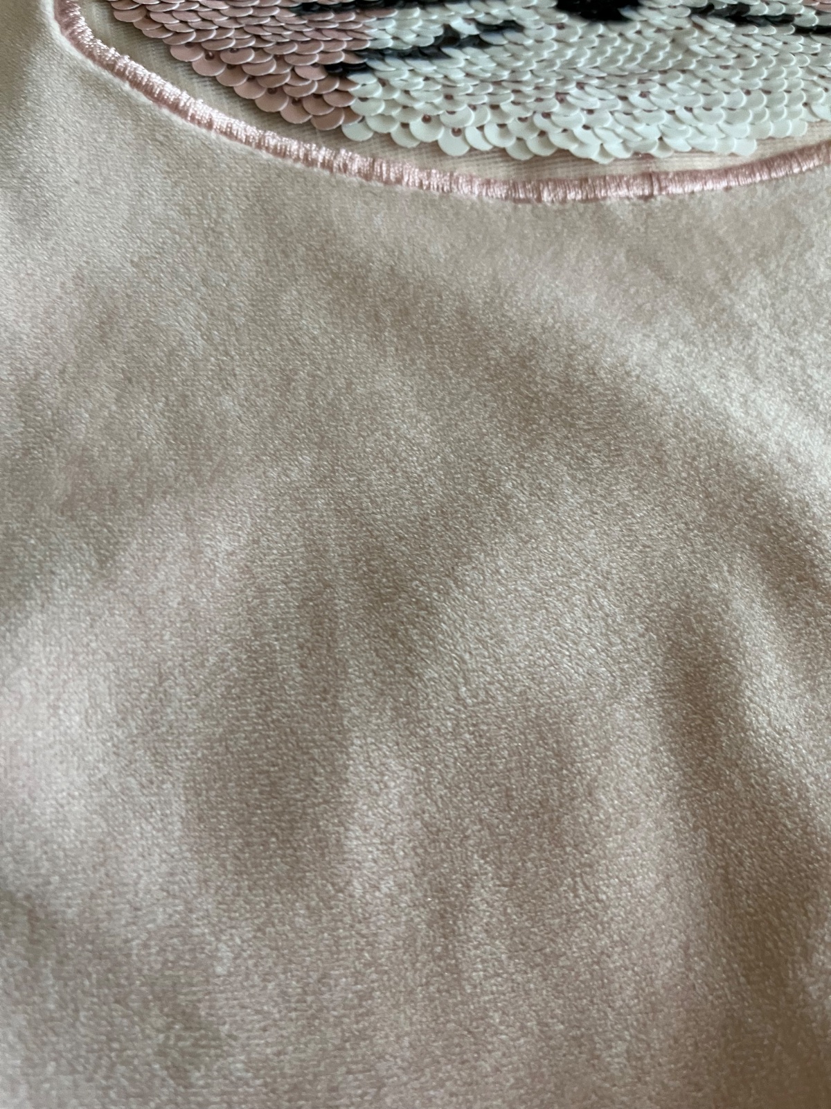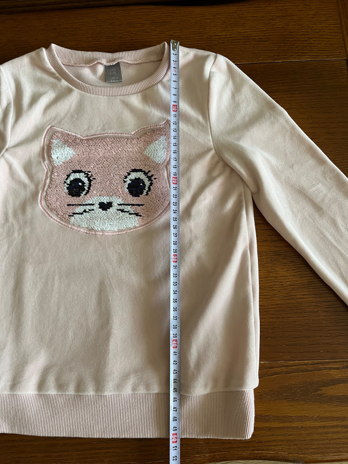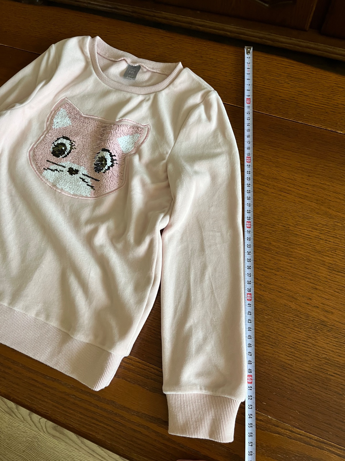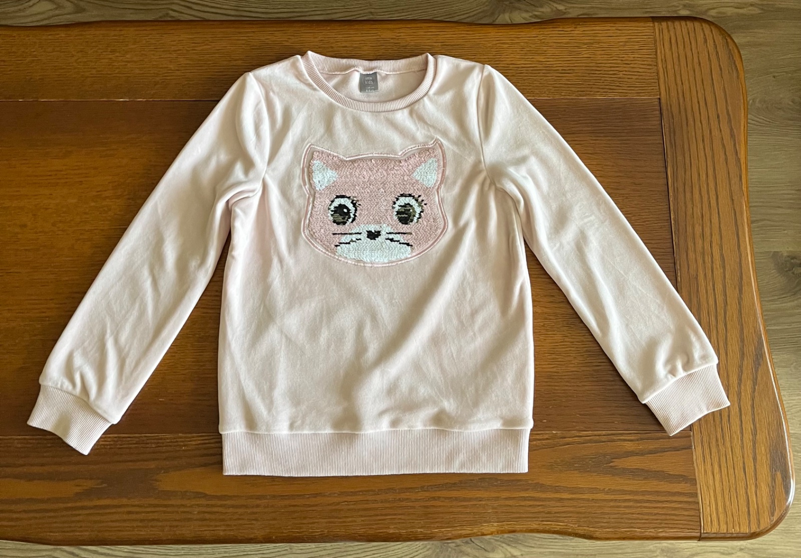 Super stav, párkrat oblečená. Teplučká chlpatka s veľkým interaktívnym premieňacím vzorom mačičky na celom prednom dieli. Flitrová mačička môže mať ružovú alebo striebornú farbu. Zvonku jemnučký zamat, zvnútra džersej.