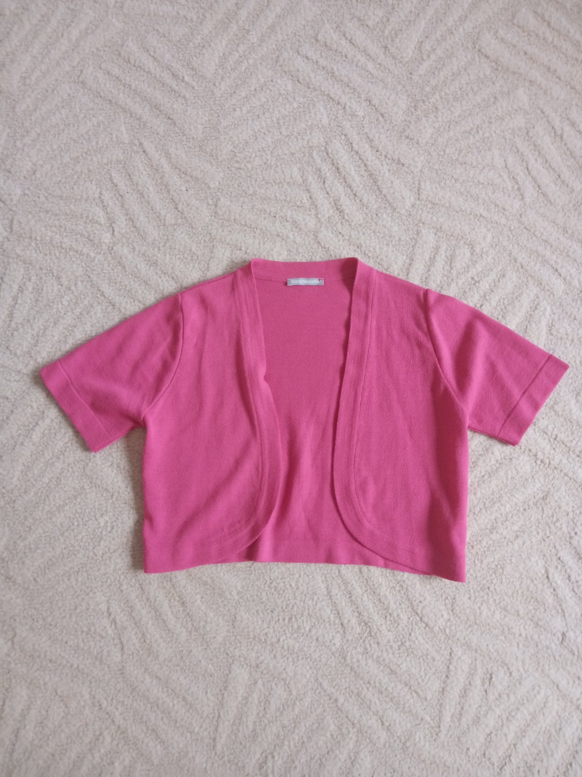 Ružové bolerko. Elastické, vzdušné. Vpredu zapletacie. Prispôsobí sa postave. Veľkosť je uvedená L/XL, no je dobré aj na M. Rukáv je ¾. Cena 5,30 € + poštovné. Platba bankovým prevodom. Dĺžka (pred...