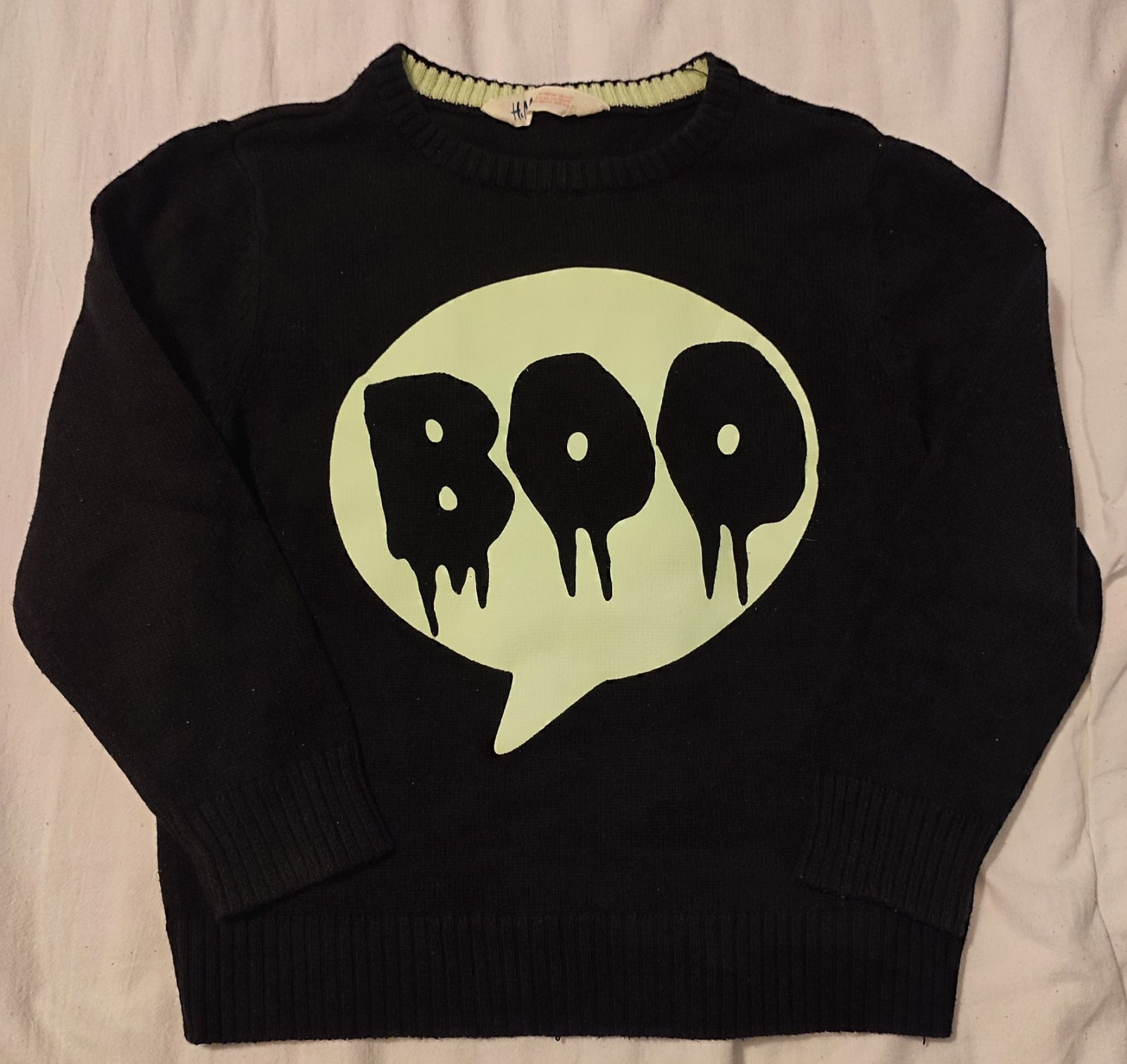 Čierny pulovrík vhodný na Helloween so svietiacim nápisom v tme, značky H&M, veľkosť 110/116 (4-6 rokov)
