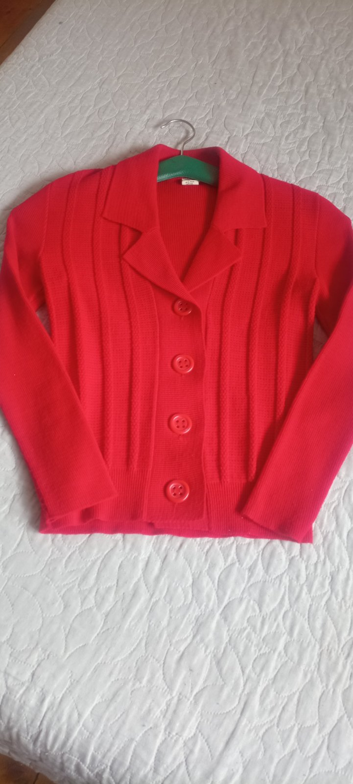Predám krásny sveter farba červená v skutočnosti je farba tmavšia taka pekná červená veľkosť píše 48 ale je to také S