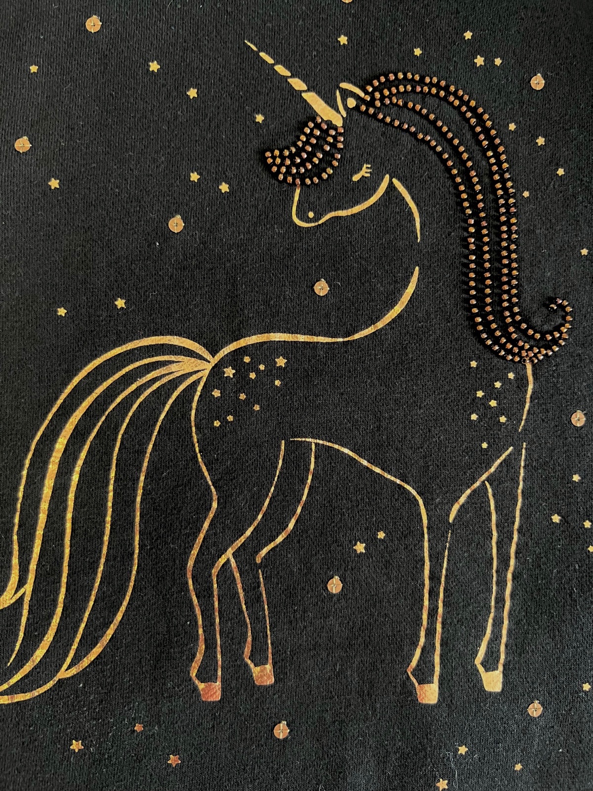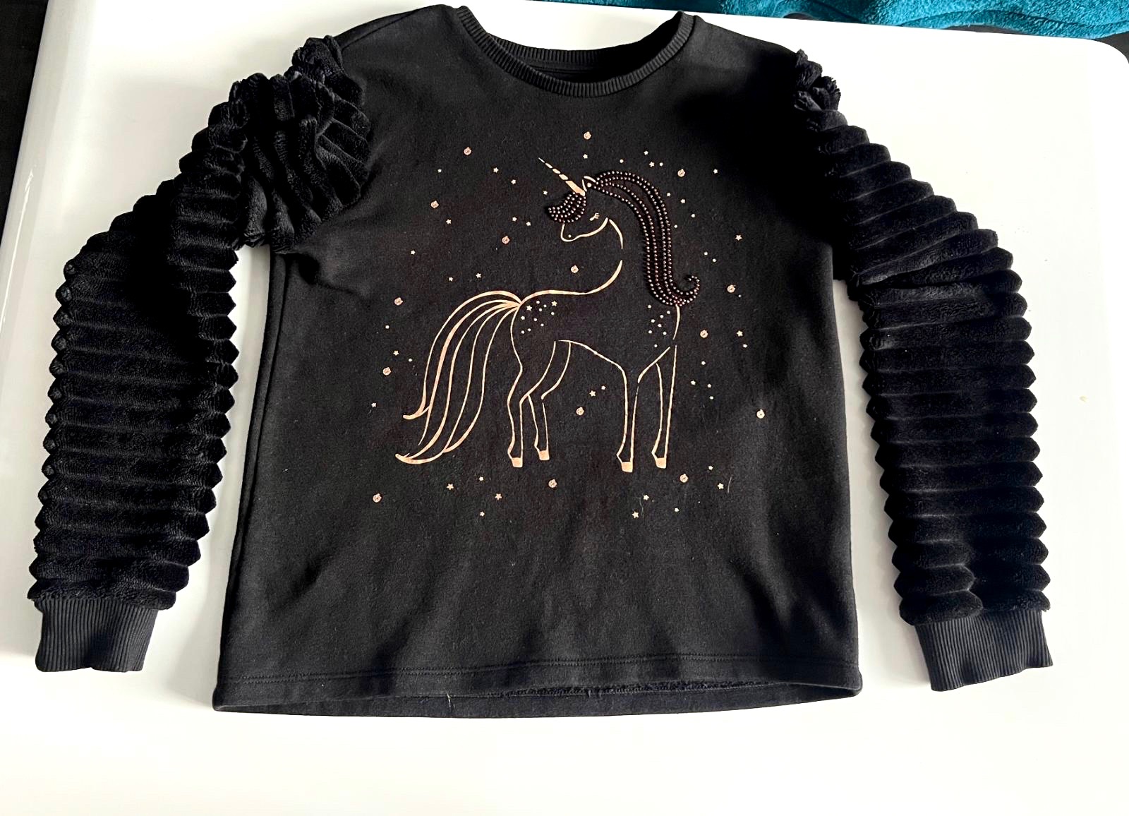 Veľmi pekný svetrik. Farba pekná čierna. Obrázok pekný zlatý . Rukávy sú makkucke, huňate.