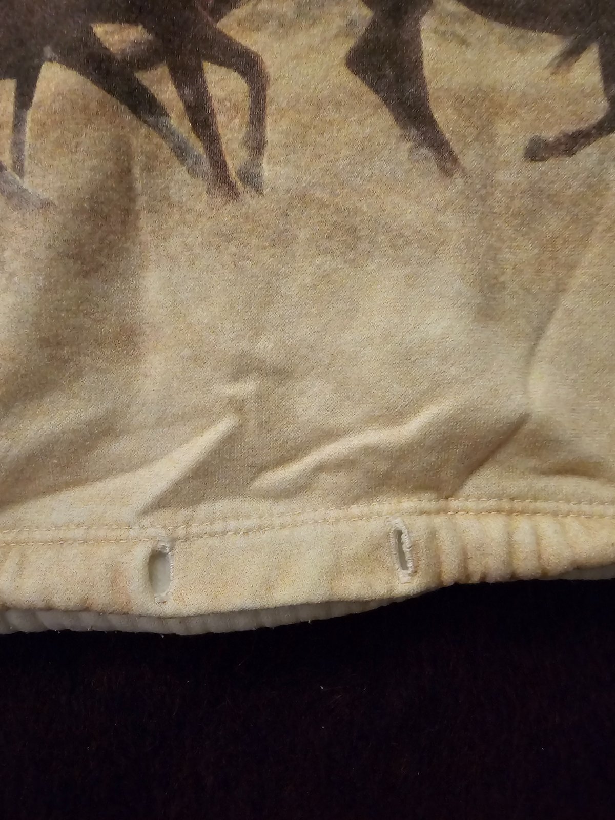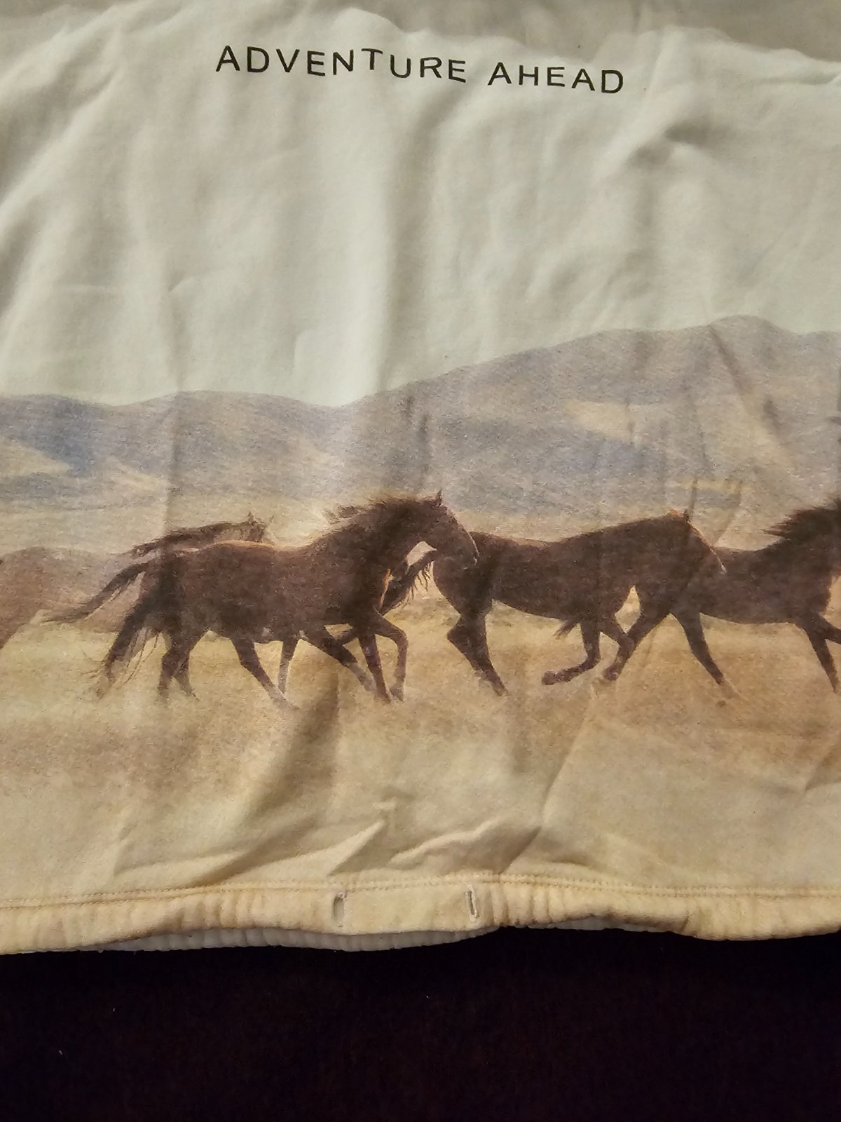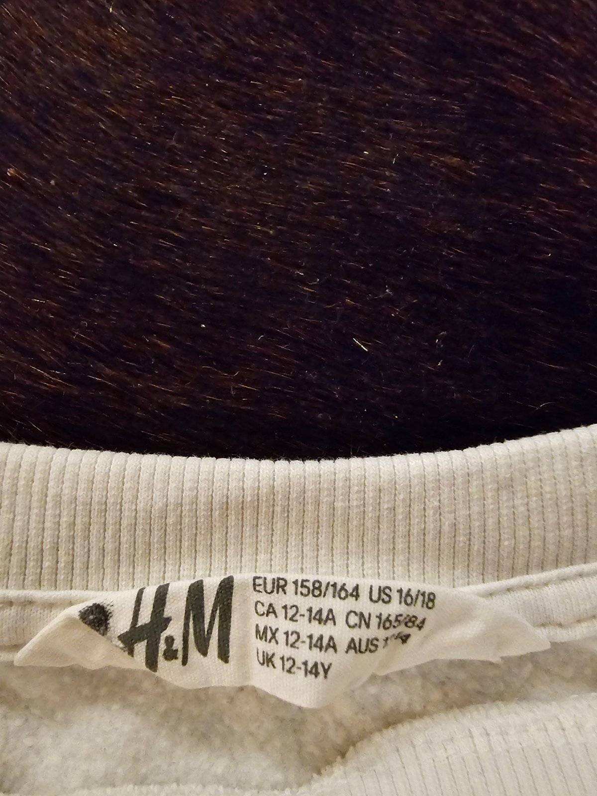 Biela mikina taka croptop- kratka s mitivom koni. Chyba dolu šnurka na stiahnutie, uvedena velkost 158/164. Dlzka 51cm, sirka 56 cm.