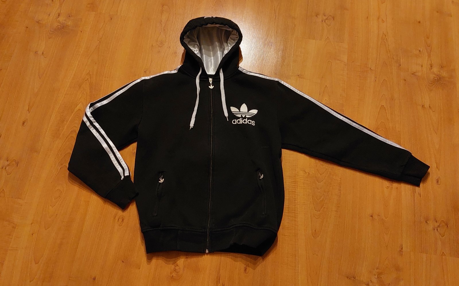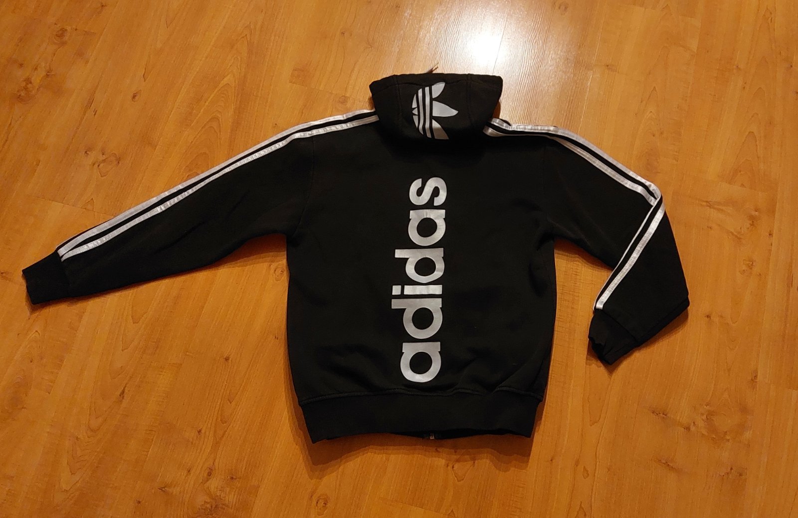 Predám mikinu zn. Adidas vo veľkosti S (170-176) v dobrom stave, nosená. Nápis na chrbáte sa trošku už praská (viď foto). Chýba kovové koliesko na kapucni pre šnúrku (viď. foto).