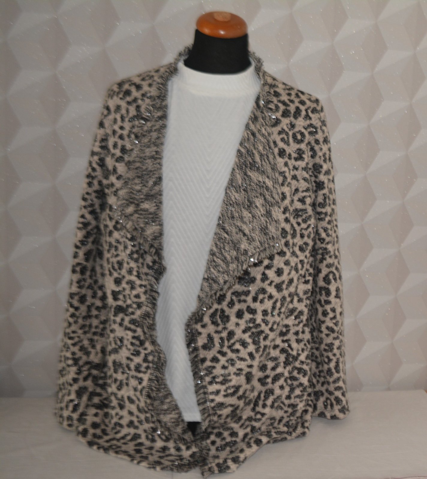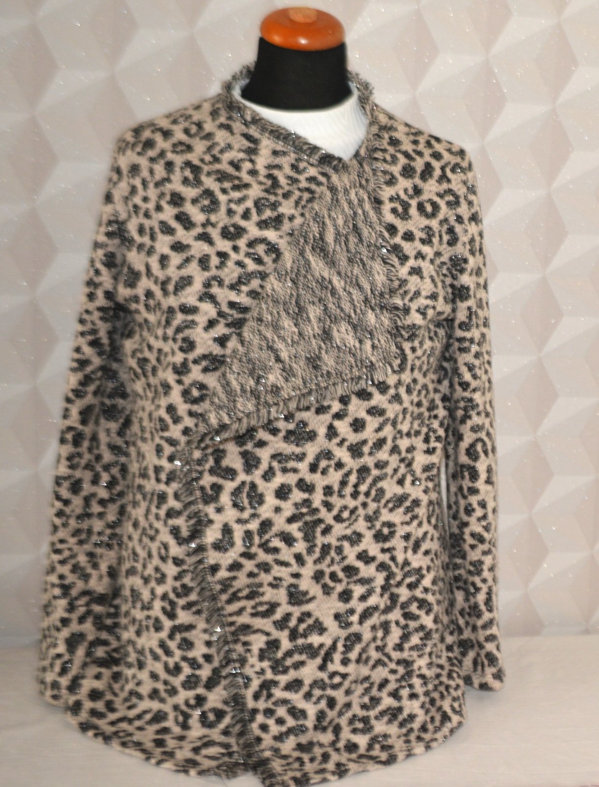 Dámsky kardigán kvalitnej značky Betty Barcley, veľ. L - rozmery: dĺžka 73cm, pod pazuchami 2x56cm, rukáv od pleca 61 a od pazuchy 46cm.