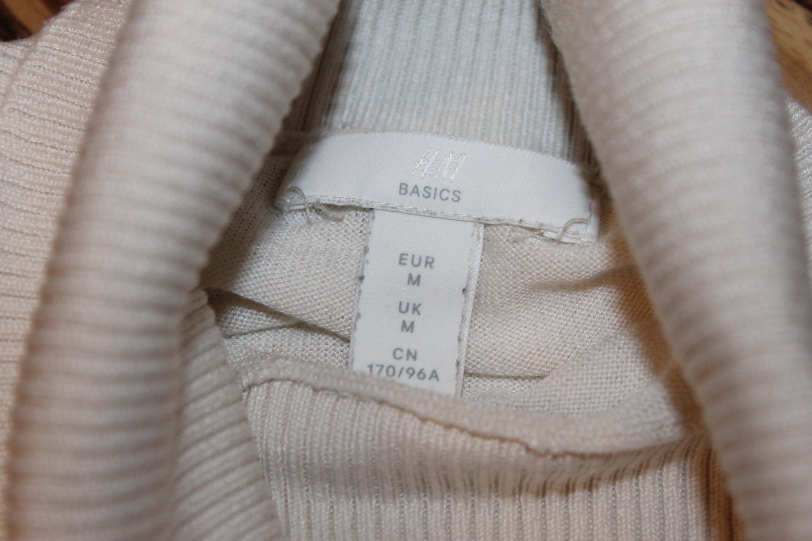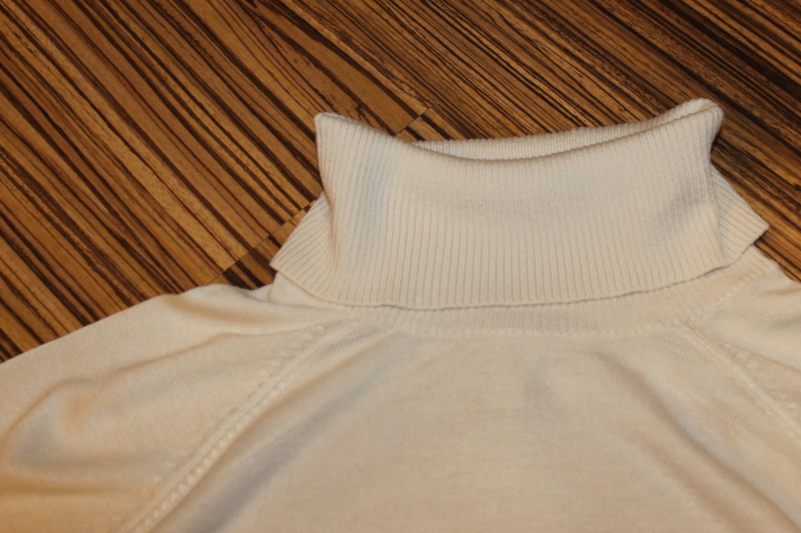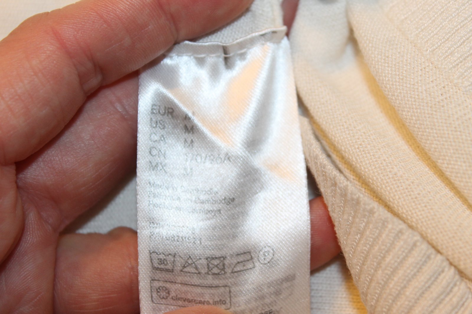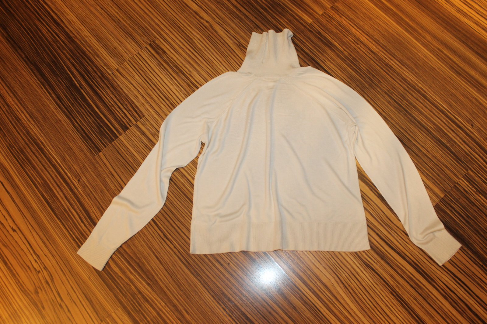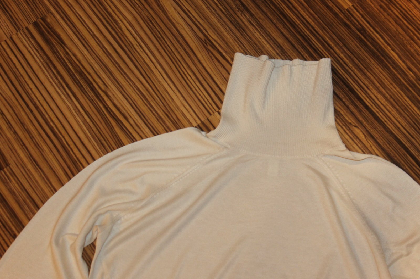 V super stave, pod pravou pazuchou zozadu zašívané, sotva viditeľné pri nosení (viď detail), inak bez poškodení. Tenší. Veľ. M, RO: š x 52 cm, dl. 57 cm, rukáv od krku 75/52 cm. Váha 196 g.