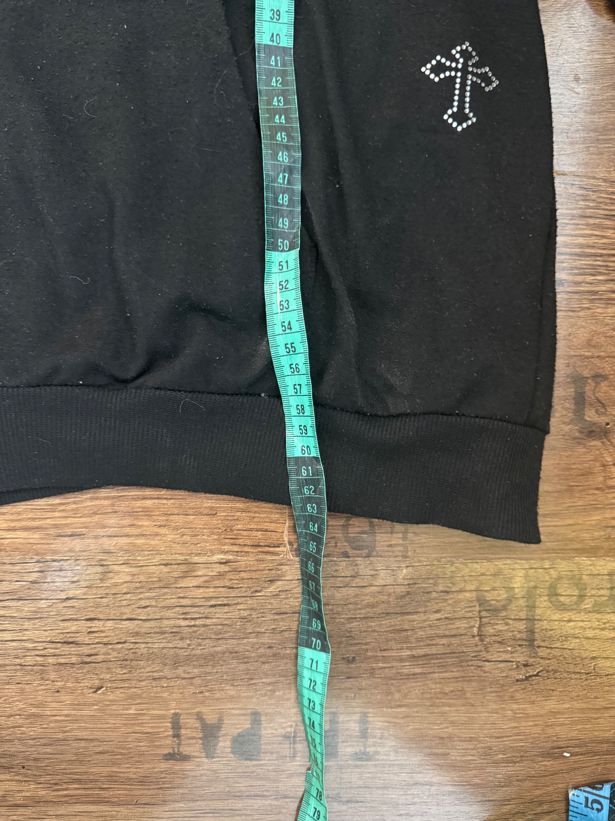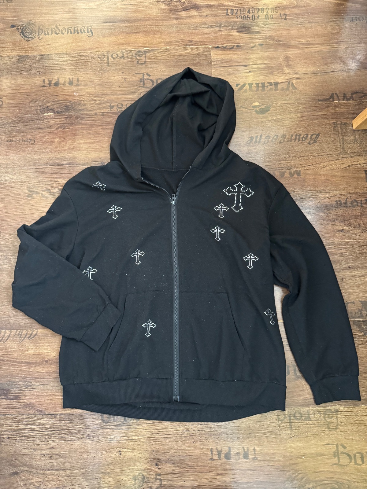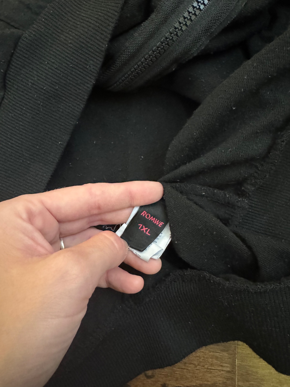 Ponúkam peknú čiernu mikinu s kapucňou a s motívom krížov. Značka je ROMWE a je vo veľkosti XL, prikladám aj rozmery. Dcéra ju nosila ako oversize a to nosí veľkosť XS, preto uvádzam menšiu veľkosť…Mala ju veľmi rada ale mení šatník. Je to taký gotický štýl. Naďalej v peknom stave, bežné známky nosenia…Poštovné podľa taríf.