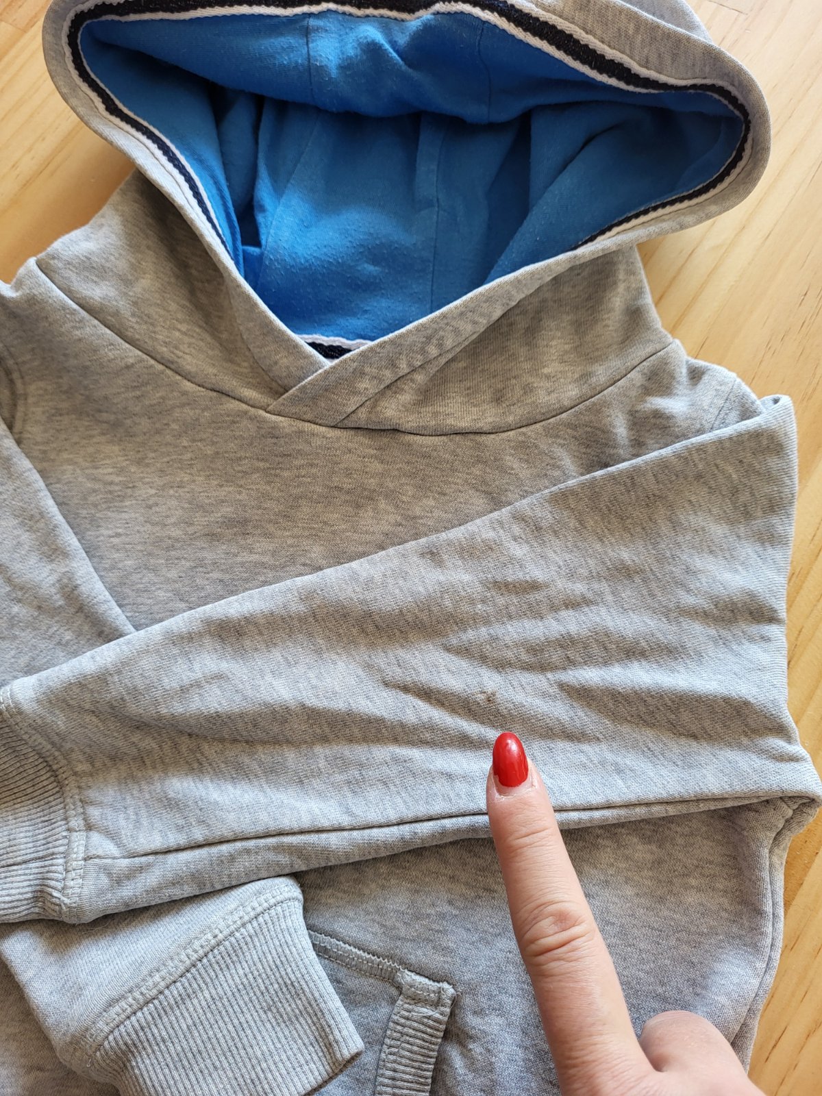 veľmi dobrý stav, šedá melírovaná časť bez žmolkov, žmolky len v kapucni na modrej látke, má dva fliačiky-viď detaily, poštovné doporučene 3,50 €