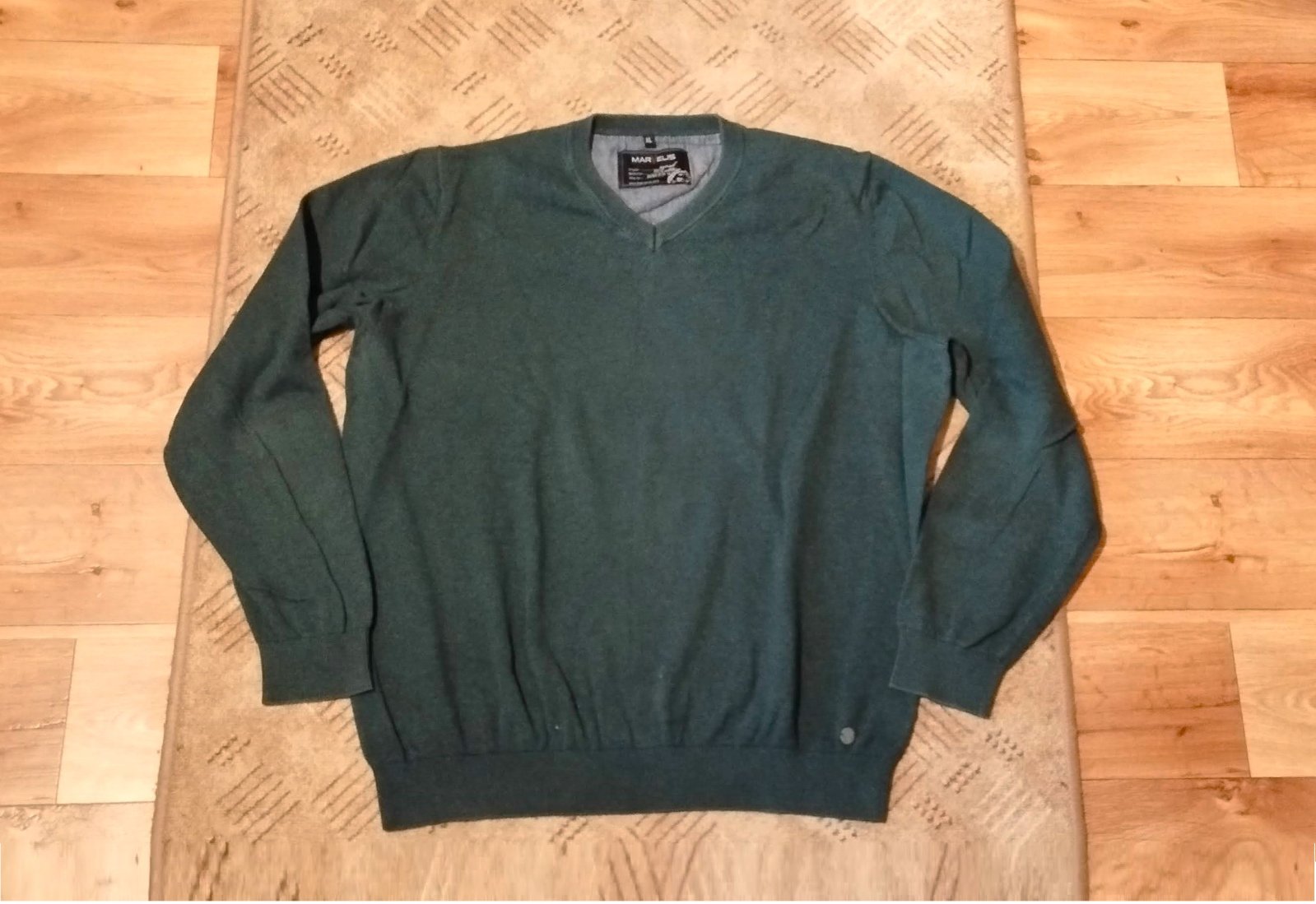 dĺžka bok 64cm, dĺžka rukáva 66cm, šírka cez prsia v nenatiahnutom stave 60cm. tmavozelená farba, Marvelis XL; Na látke mini chlpok od prania, ale nemá žmolky