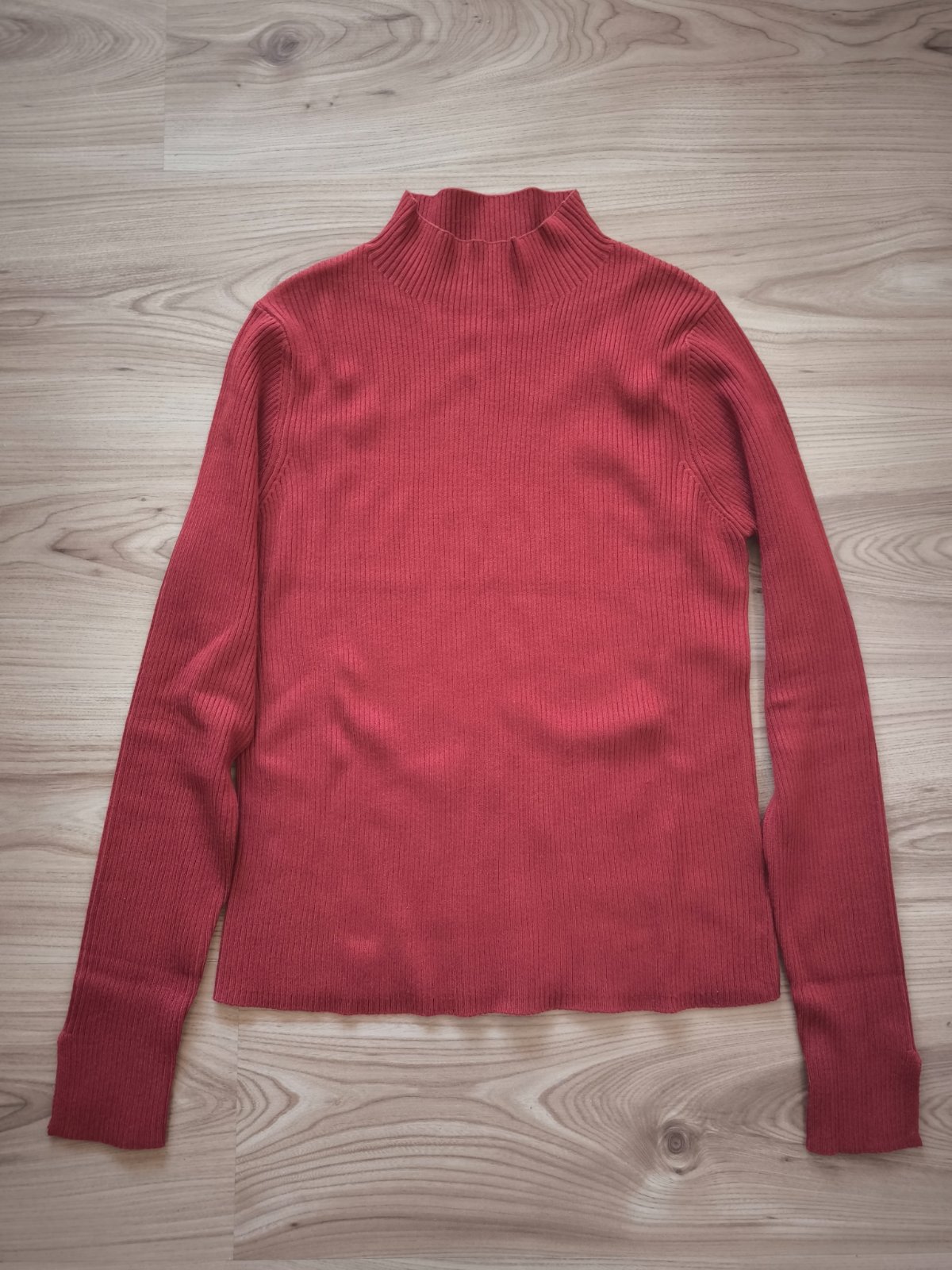 Polrolacik v krasnej farbe, odtien terakota, tmava oranzova. Zaujimavy prestrih na rukavoch. Prijemny material. Stitok uz nema, ale tusim je to H&M.