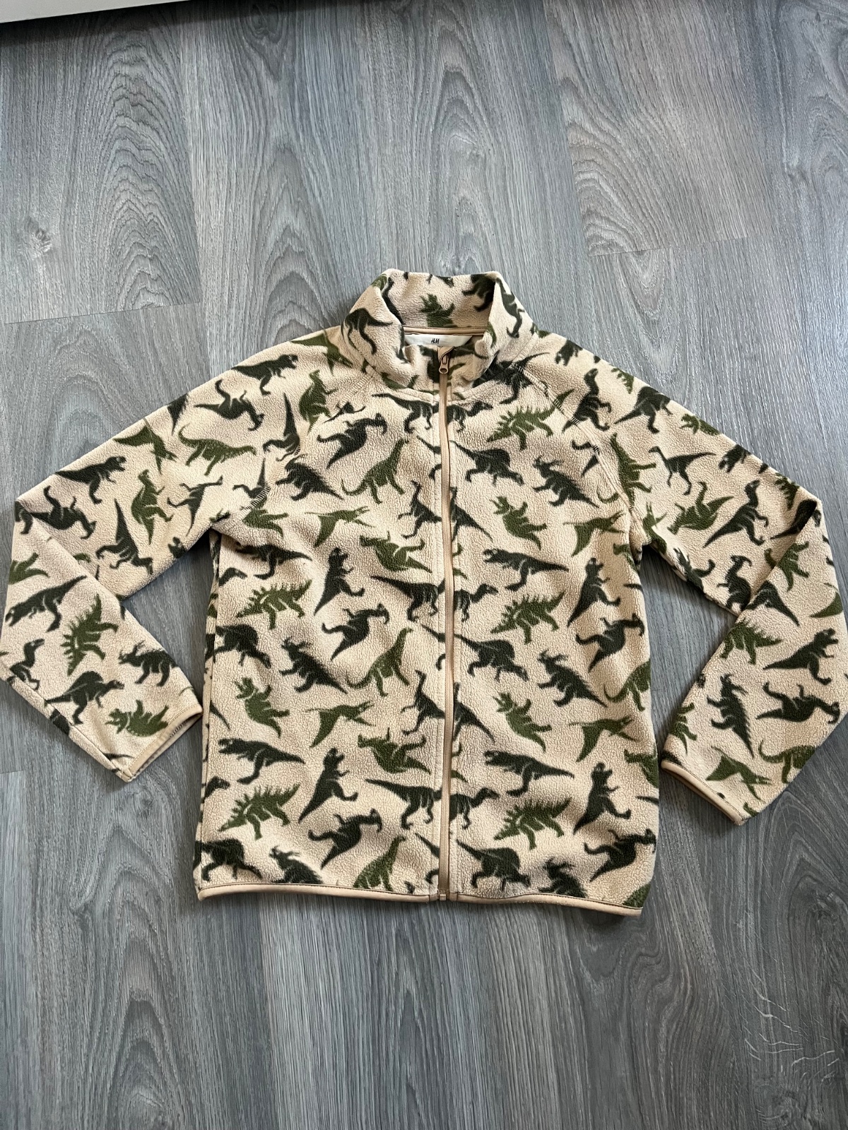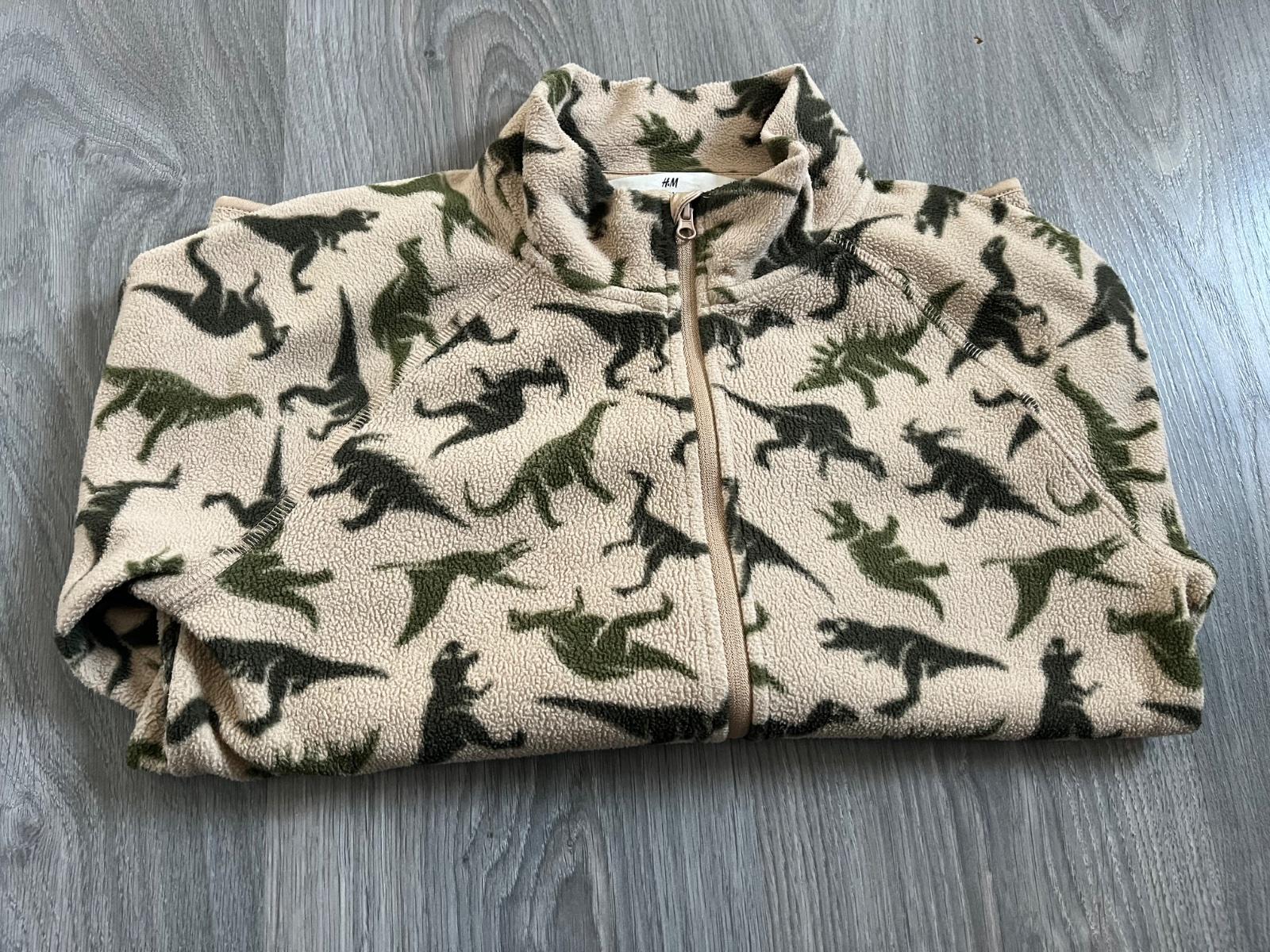 Mikina s motívom dinosaurus vo veľmi do tom nosenom stave, bez poškodení
