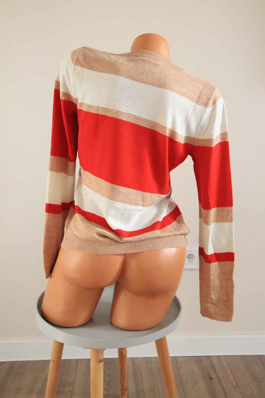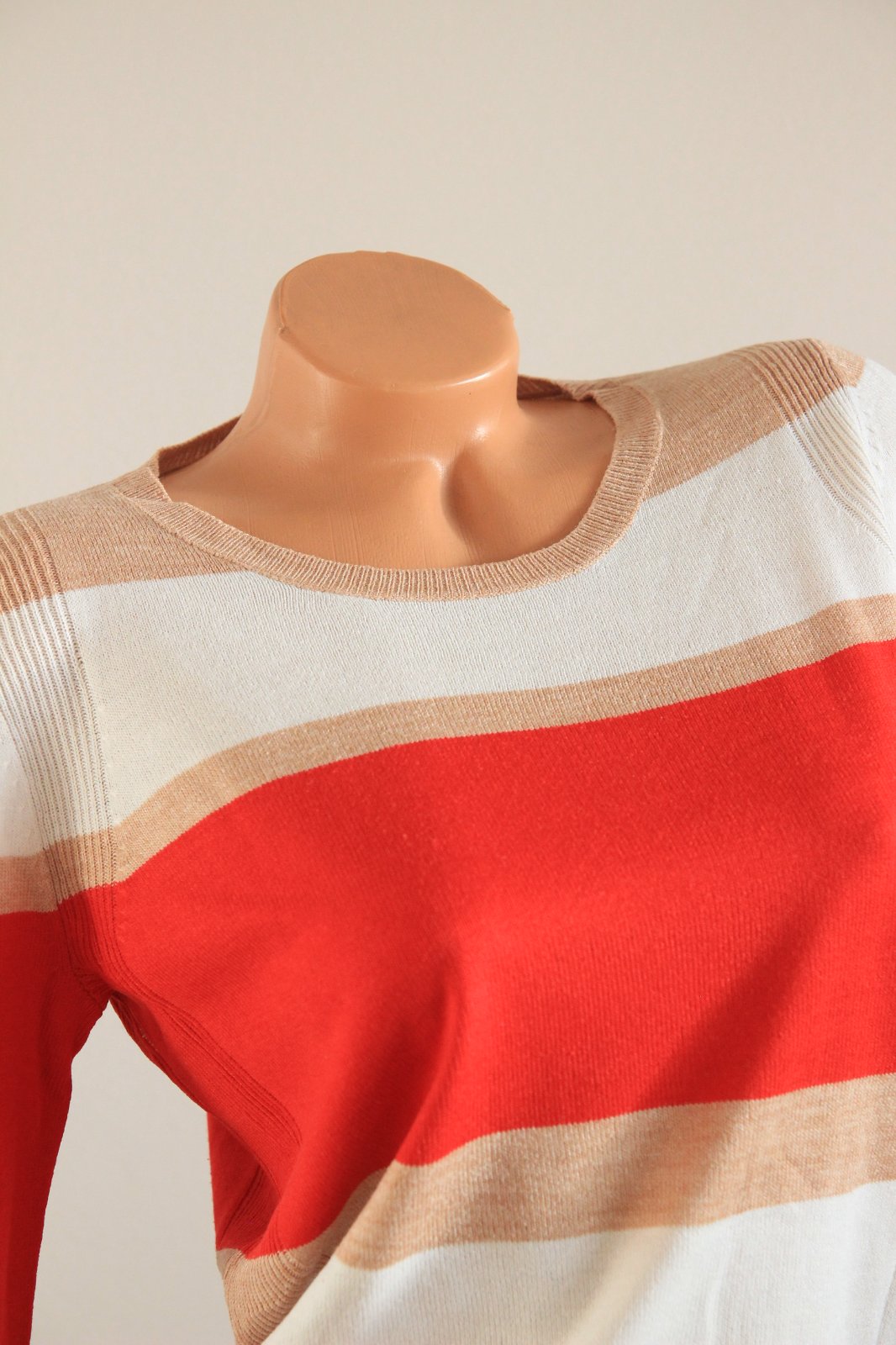 Červeno bielo béžový pásikavý sveter, veľkosť S/M.