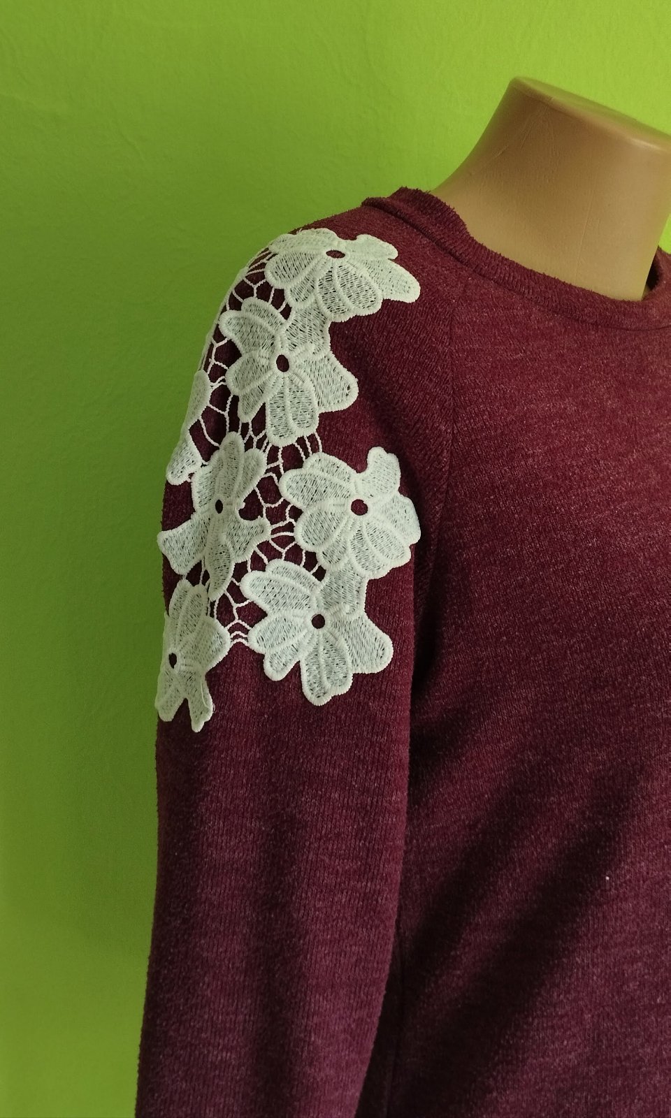 s našívanými kvetmi, dĺžka bok 62cm, rukáv od krku 75cm, cez prsia 50cm a ešte povolí;