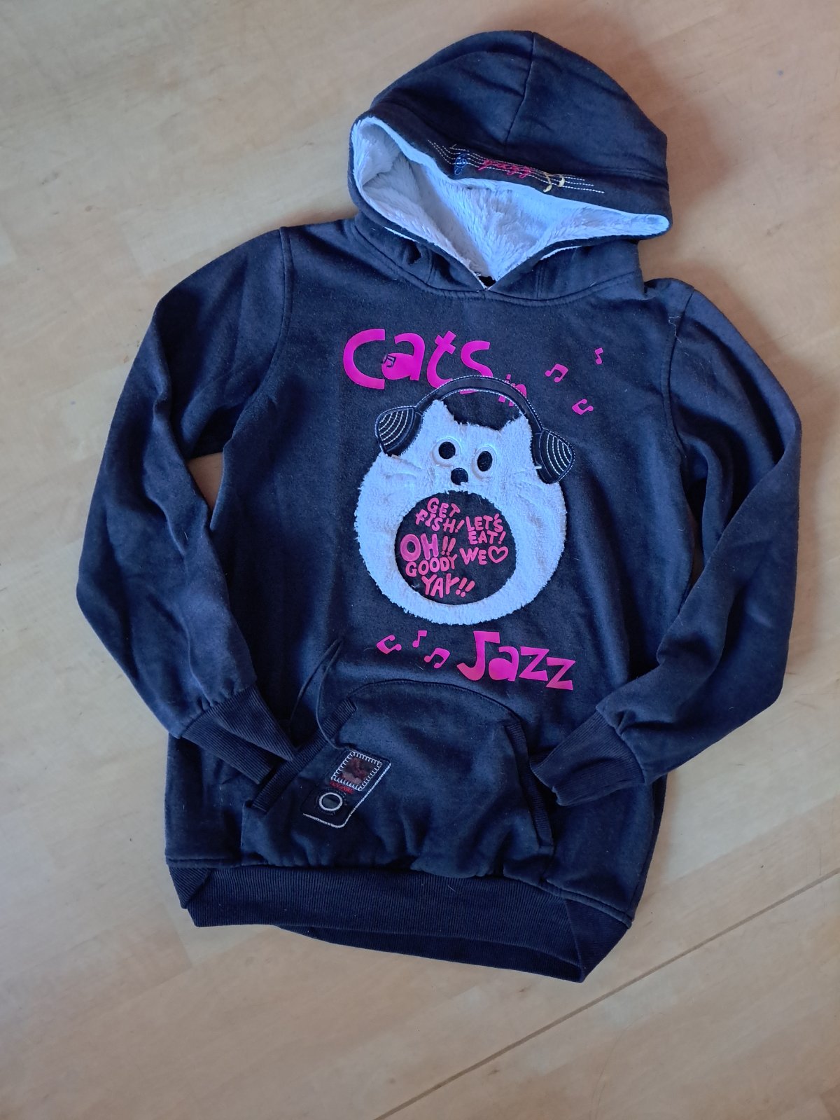 Mikina v aktuálnom štýle. Je sýto čierna, na foto tak nepôsobí. Hrubšia. Bola oblečená len raz, bez poškodení...nepodarilo sa mi ju dobre odfotiť. Veľkosť XS-S.