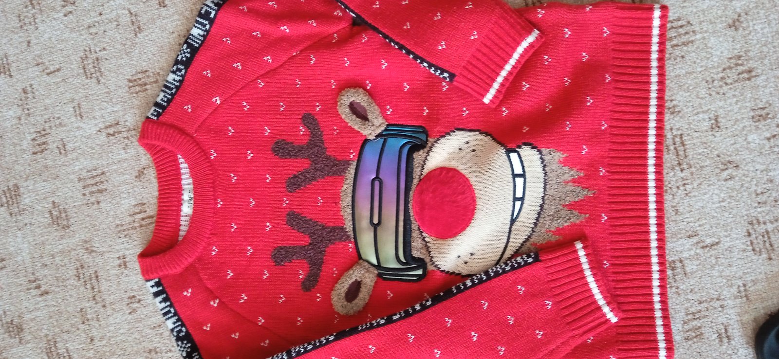 Krásny vianočný sveter ,bez poškodení, malo nosení. Zmolky na rukávoch ( vid foto ) ľahko pôjdu dole . Po stlačení nosa soba, nos svieti a hra vianočnú melódiu Veľkosť uvedená 9-10 rokov