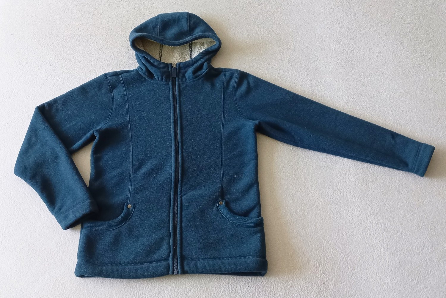 Hrubšia zateplená mikina, značka Tchibo, veľkosť 146/152. Rozmery sú na fotkách, nosená, vidieť nosenie. Nad pravým vačkom malé zlaté fliačiky, synovi sa na výtvarnej podarilo zafŕkať zlatou farbou. Na nosenie to nemá vplyv. Žiadne iné poškodenie. Máme viacero detských vecí, môžete si zostaviť vlastný balíček. Pri kúpe viac vecí, sa rada dohodnem na zľave.