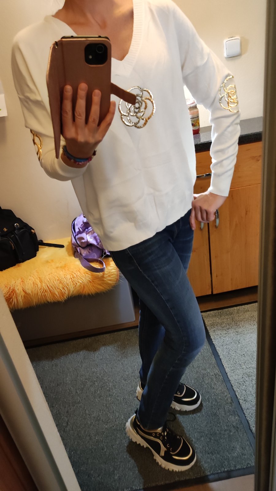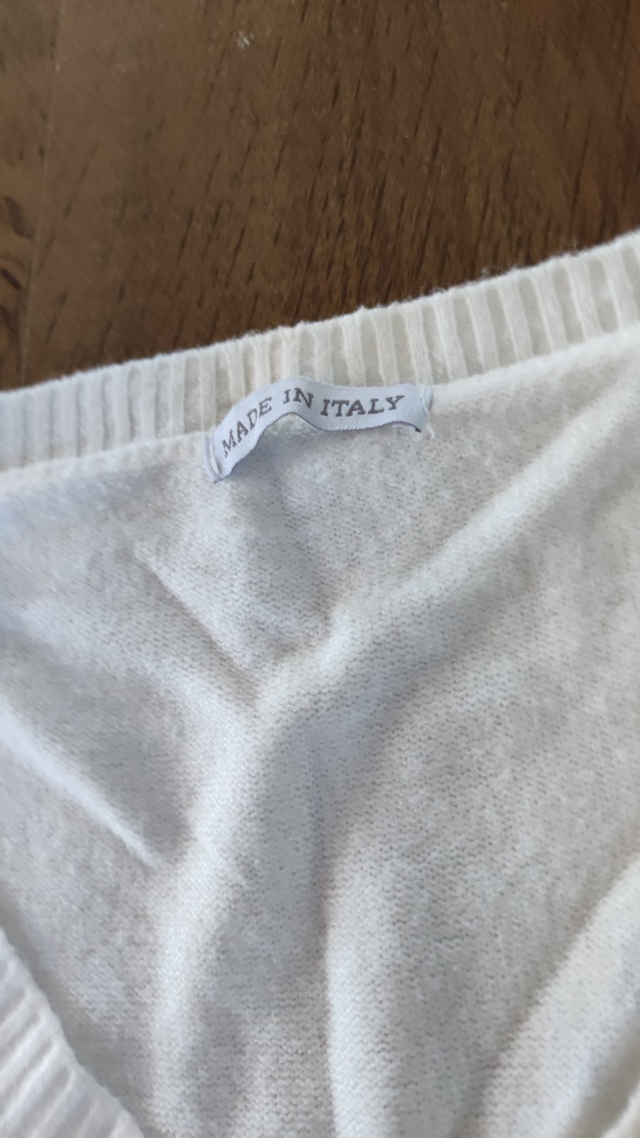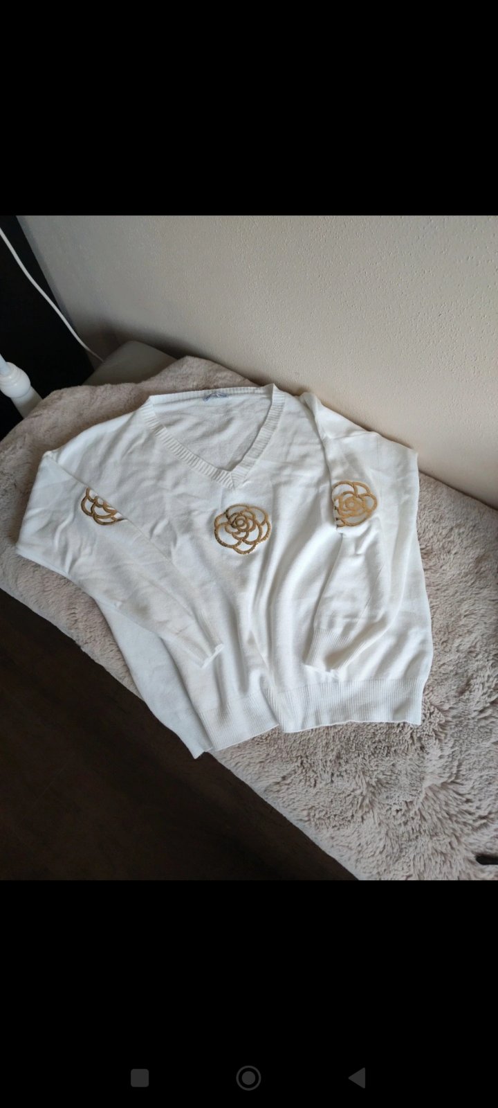 Snehovobielučký, je v ňom trblietkavá zlatá priadza miestami, bol drahý kúpila som ho v Londýne má netopier strih sexi strih možete nosiť aj stiahnut cez jedno plece, super k legínam je ako taký ka...