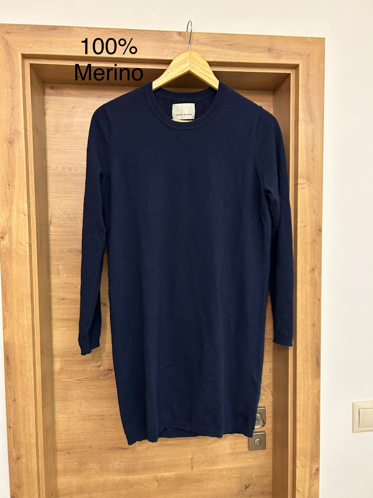 100% merino vlna. Vhodné aj ako šaty alebo ako dlhý sveter. Bez opasku. Veľmi príjemný. Samsoe samsoe značka.