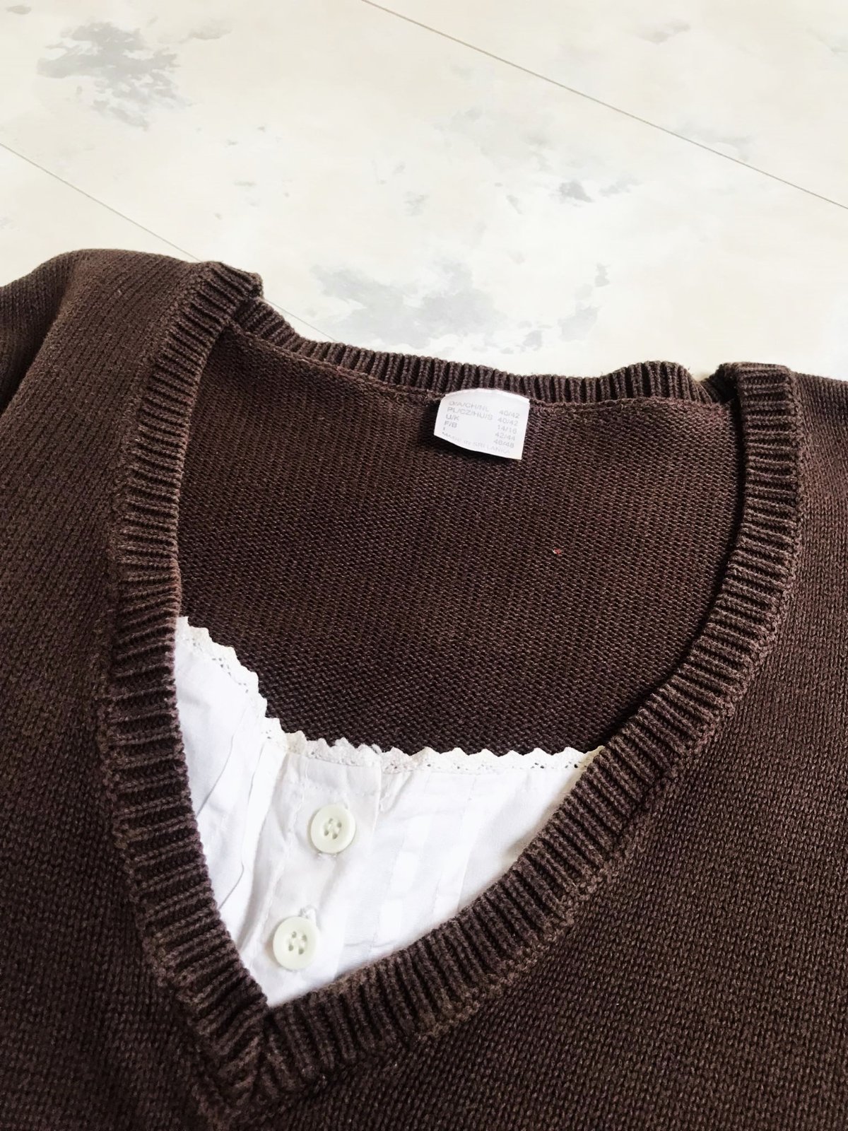 veľmi zachovalý,vo véčku všitá madeirová krajka,veľkosť 40/42 - viď štítok, šírka meraná pod pazuchou = 48 x 2 cm,dlžka celkem= 59 cm,dlžka meraná pod pazuchou = 42 cm ( je jemne vykrojený ),rukáv = 66 cm