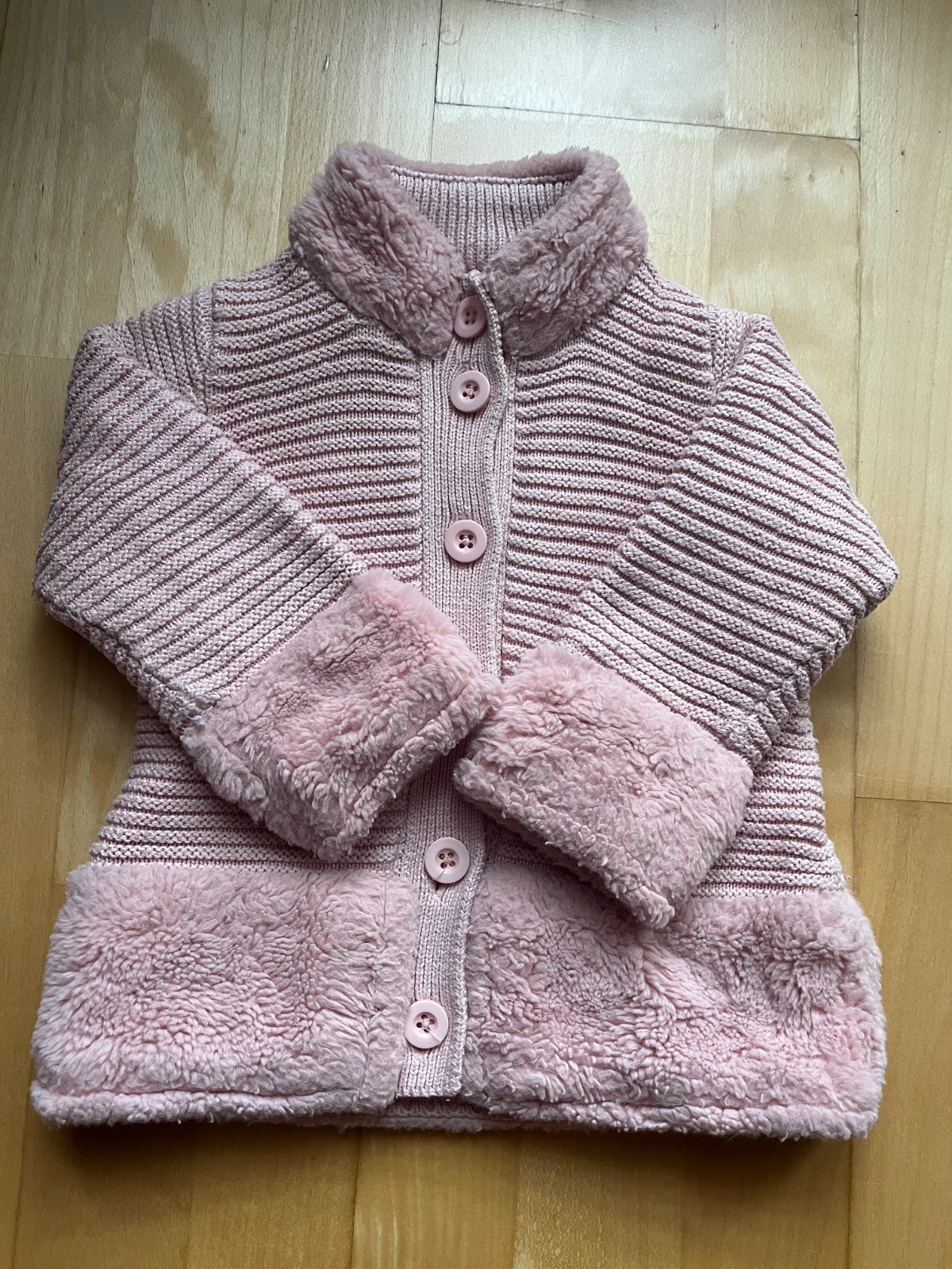 Hrubý svetrík/kabátik v svetloružovej farbe. Dcérka nosila namiesto bundy v prechodnom období, v zime pod kombinézou/bundou.